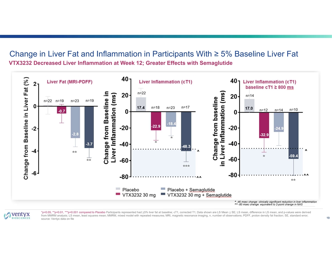 Change in Liver Fat and Inflammation in Participants With ≥ 5% Baseline Liver Fat VTX3232 Decreased Liver Inflammation at Week 12; Greater Effects with Semaglutide *p<0.05, **p<0.01, ***p<0.001 compared to Placebo Participants represented had >5% liver fat at baseline; cT1, corrected T1; Data shown are LS Mean + SE; LS mean, difference in LS mean, and p-values were derived from MMRM analysis; LS mean, least squares mean; MMRM, mixed model with repeated measures; MRI, magnetic resonance imaging, n, number of observations; PDFF, proton density fat fraction; SE, standard error; 19 source: Ventyx data on file