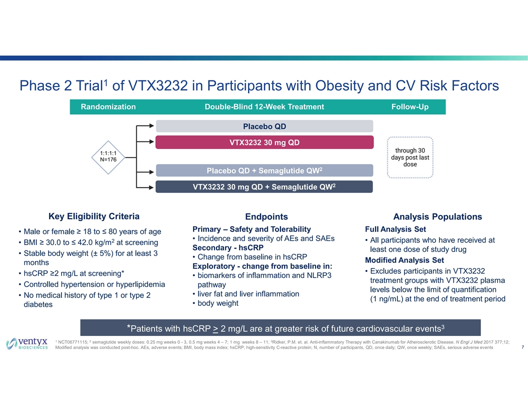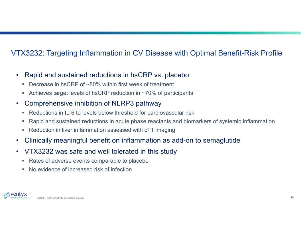 VTX3232 Phase 2 Trial Top-Line Results and Key Takeaways • Rapid and sustained reductions in hsCRP with VTX3232 vs. placebo • Statistically significant decrease in hsCRP of up to 80% within first week of treatment • Majority of participants achieved hsCRP levels of <2 mg/L at Week 12, a critical threshold for 1 determining CV risk 2 • Statistically significant reductions in IL-6 to levels below threshold for CV risk • Statistically significant reductions in Lipoprotein(a) • Statistically significant reduction in liver inflammation as measured with cT1 MRI • Clinically meaningful benefit on inflammation as add-on to semaglutide • VTX3232 was safe and well tolerated in this study • Rates of adverse events comparable to placebo (monotherapy and as add-on to semaglutide) • No effect on weight loss either as monotherapy or as add-on to semaglutide 1 2 Ridker P.M. et. al. Inflammation and cholesterol as predictors of cardiovascular events. Lancet 2023; 401:1293-301; Ridker P.M. et. al. Modulation of the interleukin-6 signalling pathway and incidence rates of ASCVD and all-cause 4 mortality, Eur Heart J,2018. CV, cardiovascular; cT1, corrected T1 imaging; MRI, magnetic resonance imaging; hsCRP, high-sensitivity C-reactive protein;