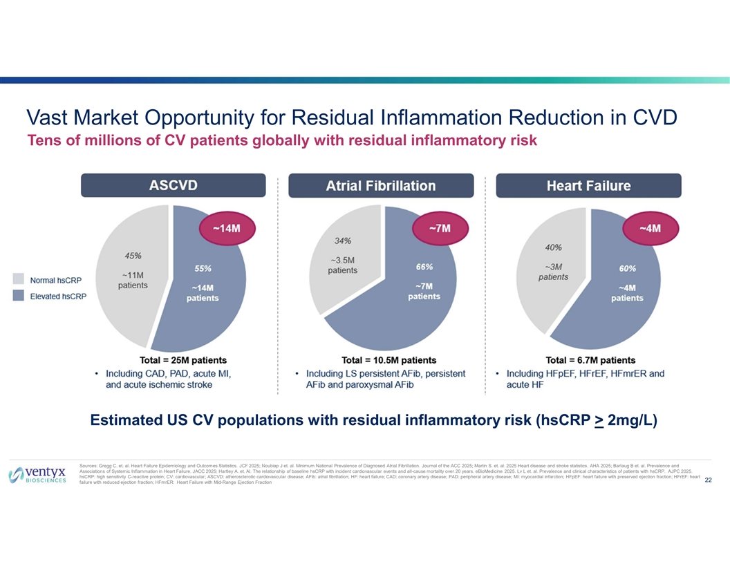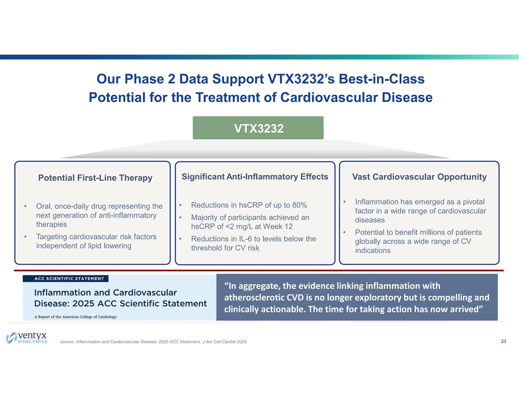 Vast Market Opportunity for Residual Inflammation Reduction in CVD Tens of millions of CV patients globally with residual inflammatory risk Estimated US CV populations with residual inflammatory risk (hsCRP > 2mg/L) Sources: Gregg C. et. al. Heart Failure Epidemiology and Outcomes Statistics. JCF 2025; Noubiap J et. al. Minimum National Prevalence of Diagnosed Atrial Fibrillation. Journal of the ACC 2025; Martin S. et. al. 2025 Heart disease and stroke statistics. AHA 2025; Barlaug B et. al. Prevalence and Associations of Systemic Inflammation in Heart Failure. JACC 2025; Hartley A. et. Al. The relationship of baseline hsCRP with incident cardiovascular events and all-cause mortality over 20 years. eBioMedicine 2025. Lv L et. al. Prevalence and clinical characteristics of patients with hsCRP. AJPC 2025. hsCRP: high sensitivity C-reactive protein; CV: cardiovascular; ASCVD: atherosclerotic cardiovascular disease; AFib: atrial fibrillation; HF: heart failure; CAD: coronary artery disease; PAD: peripheral artery disease; MI: myocardial infarction; HFpEF: heart failure with preserved ejection fraction; HFrEF: heart 22 failure with reduced ejection fraction; HFmrER: Heart Failure with Mid-Range Ejection Fraction