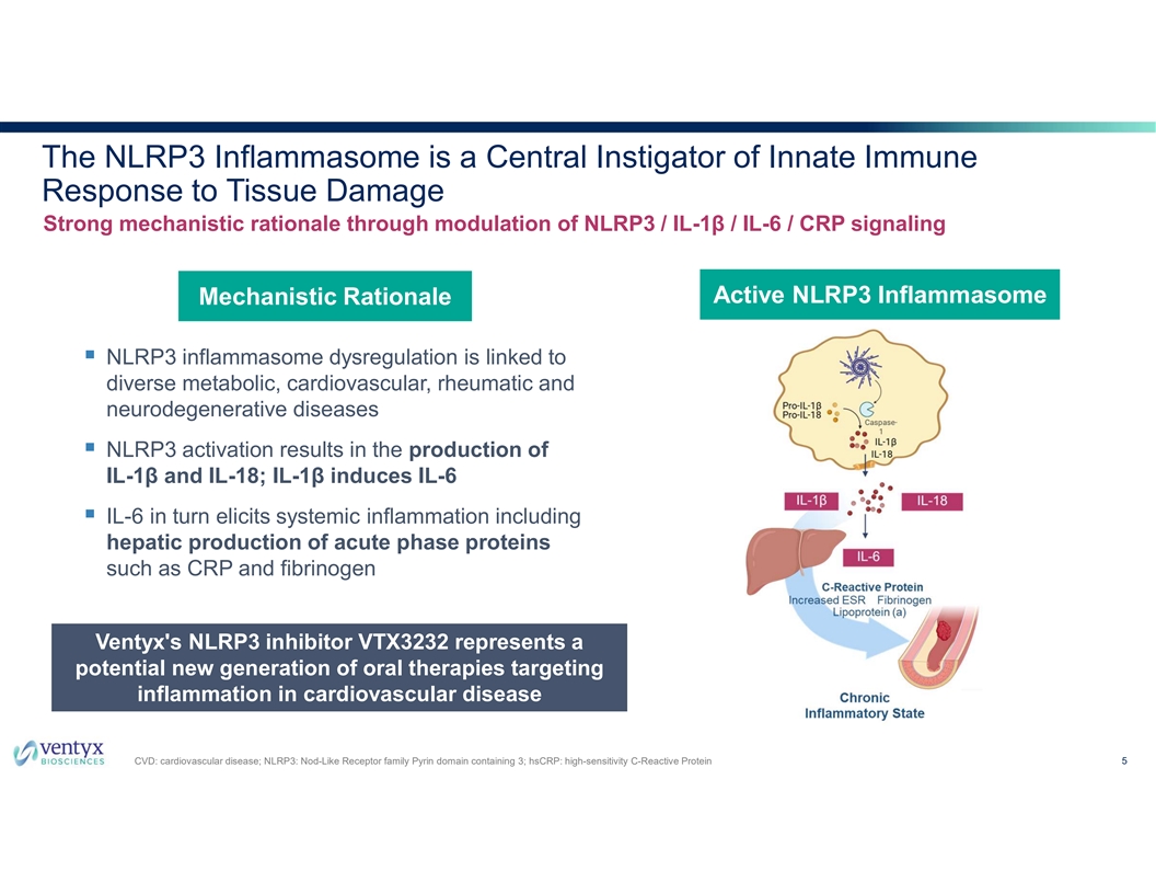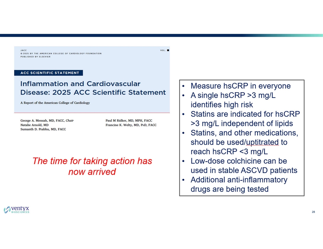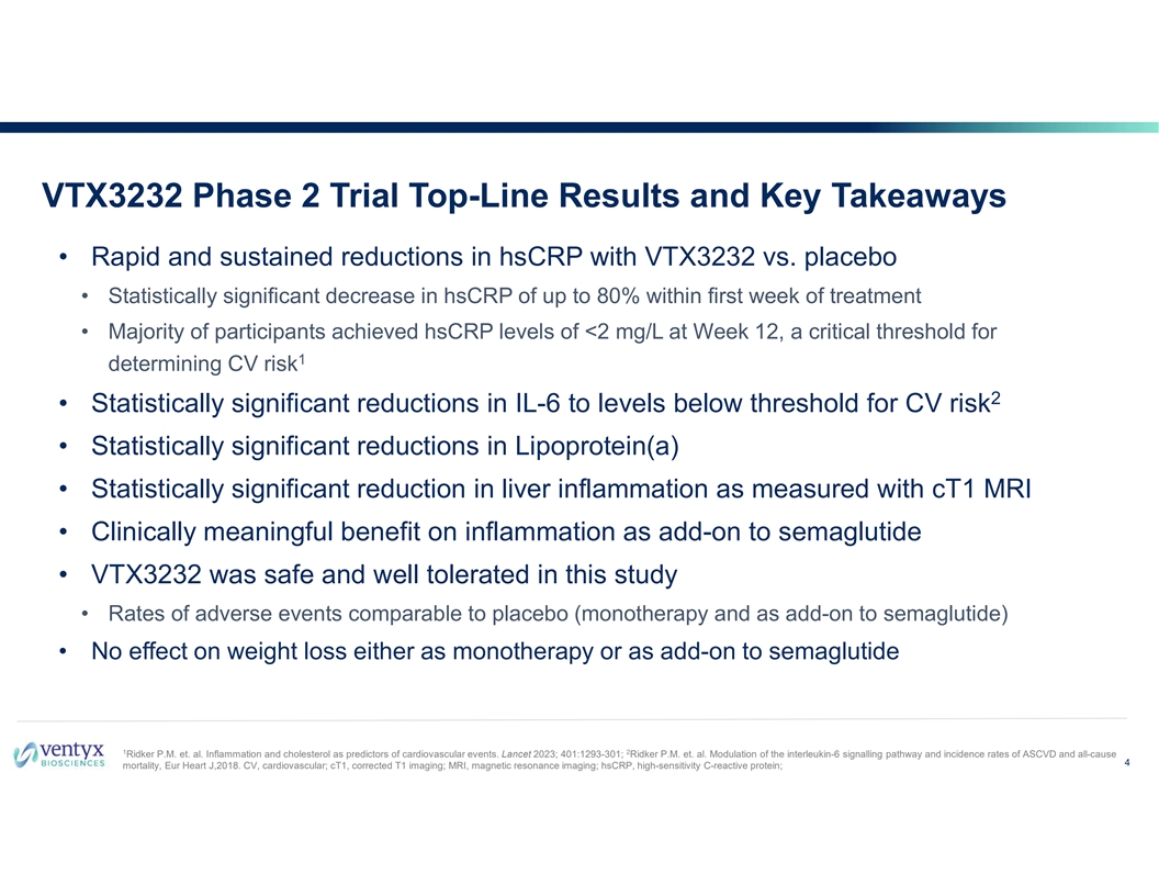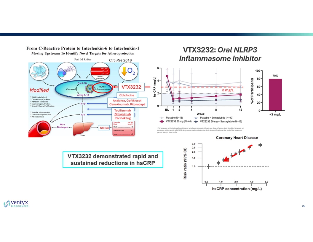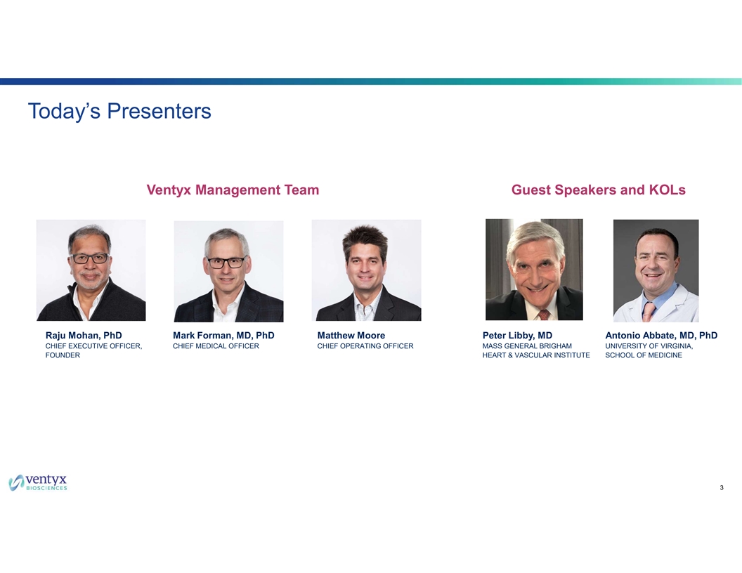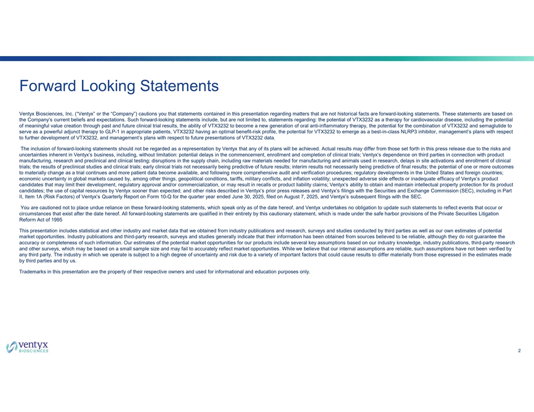 Forward Looking Statements Ventyx Biosciences, Inc. (“Ventyx” or the “Company”) cautions you that statements contained in this presentation regarding matters that are not historical facts are forward-looking statements. These statements are based on the Company’s current beliefs and expectations. Such forward-looking statements include, but are not limited to, statements regarding: the potential of VTX3232 as a therapy for cardiovascular disease, including the potential of meaningful value creation through past and future clinical trial results, the ability of VTX3232 to become a new generation of oral anti-inflammatory therapy, the potential for the combination of VTX3232 and semaglutide to serve as a powerful adjunct therapy to GLP-1 in appropriate patients, VTX3232 having an optimal benefit-risk profile, the potential for VTX3232 to emerge as a best-in-class NLRP3 inhibitor, management’s plans with respect to further development of VTX3232, and management’s plans with respect to future presentations of VTX3232 data. The inclusion of forward-looking statements should not be regarded as a representation by Ventyx that any of its plans will be achieved. Actual results may differ from those set forth in this press release due to the risks and uncertainties inherent in Ventyx’s business, including, without limitation: potential delays in the commencement, enrollment and completion of clinical trials; Ventyx’s dependence on third parties in connection with product manufacturing, research and preclinical and clinical testing; disruptions in the supply chain, including raw materials needed for manufacturing and animals used in research, delays in site activations and enrollment of clinical trials; the results of preclinical studies and clinical trials; early clinical trials not necessarily being predictive of future results; interim results not necessarily being predictive of final results; the potential of one or more outcomes to materially change as a trial continues and more patient data become available, and following more comprehensive audit and verification procedures; regulatory developments in the United States and foreign countries; economic uncertainty in global markets caused by, among other things, geopolitical conditions, tariffs, military conflicts, and inflation volatility; unexpected adverse side effects or inadequate efficacy of Ventyx’s product candidates that may limit their development, regulatory approval and/or commercialization, or may result in recalls or product liability claims; Ventyx’s ability to obtain and maintain intellectual property protection for its product candidates; the use of capital resources by Ventyx sooner than expected; and other risks described in Ventyx’s prior press releases and Ventyx’s filings with the Securities and Exchange Commission (SEC), including in Part II, Item 1A (Risk Factors) of Ventyx’s Quarterly Report on Form 10-Q for the quarter year ended June 30, 2025, filed on August 7, 2025, and Ventyx’s subsequent filings with the SEC. You are cautioned not to place undue reliance on these forward-looking statements, which speak only as of the date hereof, and Ventyx undertakes no obligation to update such statements to reflect events that occur or circumstances that exist after the date hereof. All forward-looking statements are qualified in their entirety by this cautionary statement, which is made under the safe harbor provisions of the Private Securities Litigation Reform Act of 1995 This presentation includes statistical and other industry and market data that we obtained from industry publications and research, surveys and studies conducted by third parties as well as our own estimates of potential market opportunities. Industry publications and third-party research, surveys and studies generally indicate that their information has been obtained from sources believed to be reliable, although they do not guarantee the accuracy or completeness of such information. Our estimates of the potential market opportunities for our products include several key assumptions based on our industry knowledge, industry publications, third-party research and other surveys, which may be based on a small sample size and may fail to accurately reflect market opportunities. While we believe that our internal assumptions are reliable, such assumptions have not been verified by any third party. The industry in which we operate is subject to a high degree of uncertainty and risk due to a variety of important factors that could cause results to differ materially from those expressed in the estimates made by third parties and by us. Trademarks in this presentation are the property of their respective owners and used for informational and education purposes only. 2