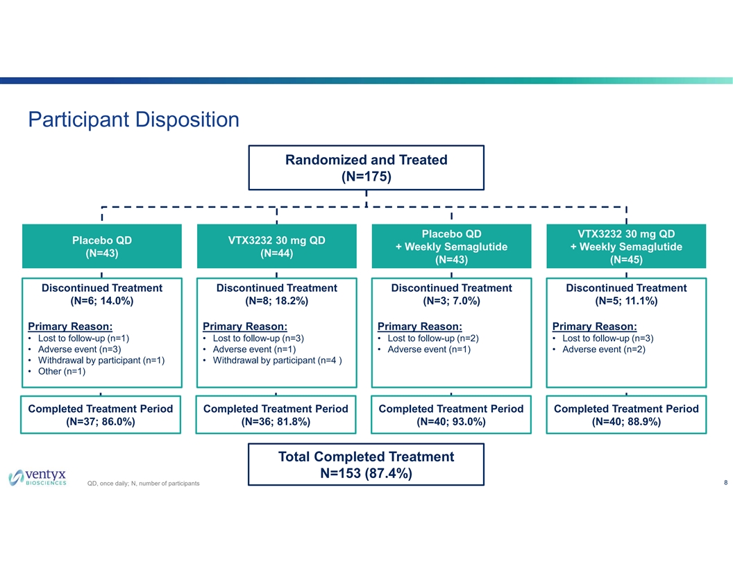 1 Phase 2 Trial of VTX3232 in Participants with Obesity and CV Risk Factors Randomization Double-Blind 12-Week Treatment Follow-Up Placebo QD VTX3232 30 mg QD 1:1:1:1 N=176 * 2 Placebo QD + Semaglutide QW * * 2 VTX3232 30 mg QD + Semaglutide QW * Key Eligibility Criteria Endpoints Analysis Populations Primary – Safety and Tolerability Full Analysis Set • Male or female ≥ 18 to ≤ 80 years of age • Incidence and severity of AEs and SAEs 2 • All participants who have received at • BMI ≥ 30.0 to ≤ 42.0 kg/m at screening Secondary - hsCRP least one dose of study drug • Stable body weight (± 5%) for at least 3 • Change from baseline in hsCRP Modified Analysis Set months Exploratory - change from baseline in: • Excludes participants in VTX3232 • hsCRP ≥2 mg/L at screening* • biomarkers of inflammation and NLRP3 treatment groups with VTX3232 plasma • Controlled hypertension or hyperlipidemia pathway levels below the limit of quantification • liver fat and liver inflammation • No medical history of type 1 or type 2 (1 ng/mL) at the end of treatment period • body weight diabetes 3 *Patients with hsCRP > 2 mg/L are at greater risk of future cardiovascular events 1 2 3 NCT06771115; semaglutide weekly doses: 0.25 mg weeks 0 - 3, 0.5 mg weeks 4 – 7; 1 mg weeks 8 – 11; Ridker, P.M. et. al. Anti-inflammatory Therapy with Canakinumab for Atherosclerotic Disease. N Engl J Med 2017 377;12; 7 Modified analysis was conducted post-hoc. AEs, adverse events; BMI, body mass index; hsCRP, high-sensitivity C-reactive protein; N, number of participants, QD, once daily; QW, once weekly; SAEs, serious adverse events