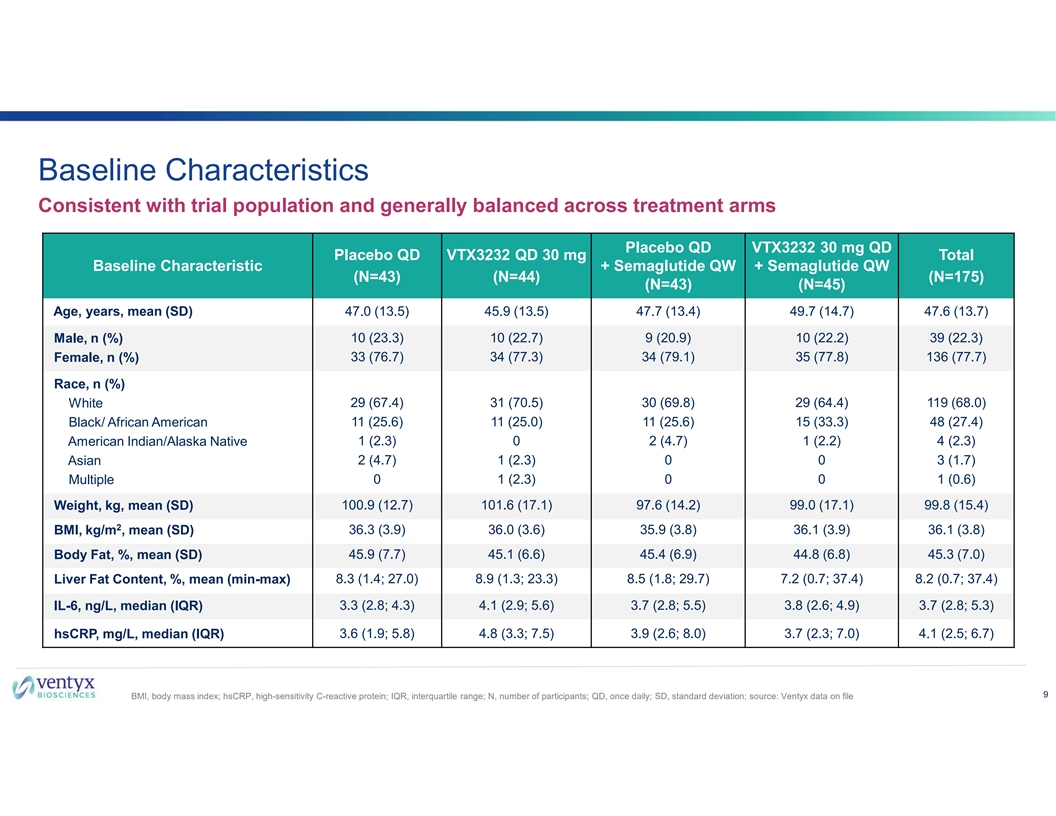 Participant Disposition Randomized and Treated (N=175) P Plla ac ce eb bo o Q QD D V VT TX X3 32 23 32 2 3 30 0 m mg g Q QD D P Plla ac ce eb bo o Q QD D V VT TX X3 32 23 32 2 3 30 0 m mg g Q QD D + + W We ee ek klly y S Se em ma ag gllu ut tiid de e + + W We ee ek klly y S Se em ma ag gllu ut tiid de e ( (N N= =4 43 3) ) ( (N N= =4 44 4) ) ( (N N= =4 43 3) ) ( (N N= =4 45 5) ) Discontinued Treatment Discontinued Treatment Discontinued Treatment Discontinued Treatment (N=6; 14.0%) (N=8; 18.2%) (N=3; 7.0%) (N=5; 11.1%) Primary Reason: Primary Reason: Primary Reason: Primary Reason: • Lost to follow-up (n=1) • Lost to follow-up (n=3) • Lost to follow-up (n=2) • Lost to follow-up (n=3) • Adverse event (n=3) • Adverse event (n=1) • Adverse event (n=1) • Adverse event (n=2) • Withdrawal by participant (n=1) • Withdrawal by participant (n=4 ) • Other (n=1) Completed Treatment Period Completed Treatment Period Completed Treatment Period Completed Treatment Period (N=37; 86.0%) (N=36; 81.8%) (N=40; 93.0%) (N=40; 88.9%) Total Completed Treatment N=153 (87.4%) 8 QD, once daily; N, number of participants