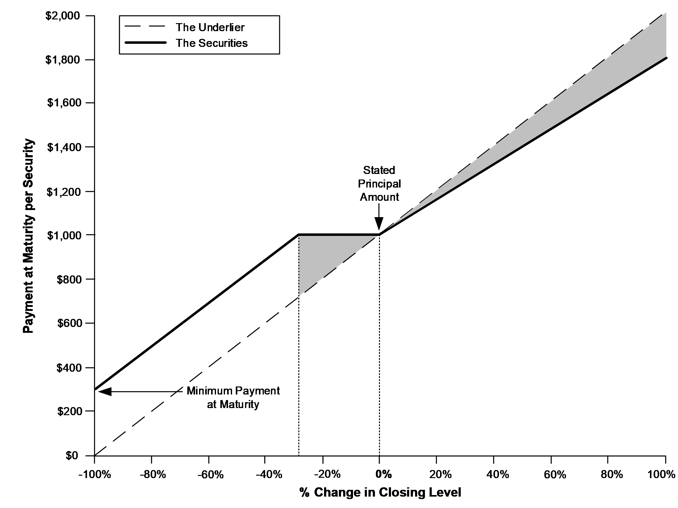 •If the final level is greater than the initial level: stated principal amount + upside payment •If the final level is equal to or less than the initial level but is greater than or equal to the buffer level: stated principal amount •If the final level is less than the buffer level: stated principal amount × (performance factor + buffer amount) Under these circumstances, the payment at maturity will be less, and may be significantly less, than the stated principal amount, subject to the minimum payment at maturity. |