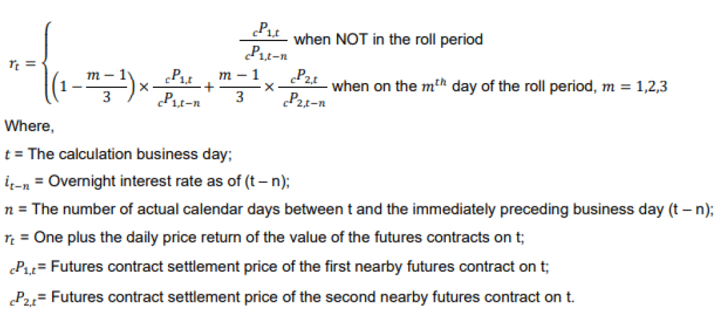 The RTYFPE Index, calculated from the price change of the futures contract, reflects the excess return of the Russell 2000 Futures Index. The level of the RTYFPE Index on a trading day is calculated as follows: