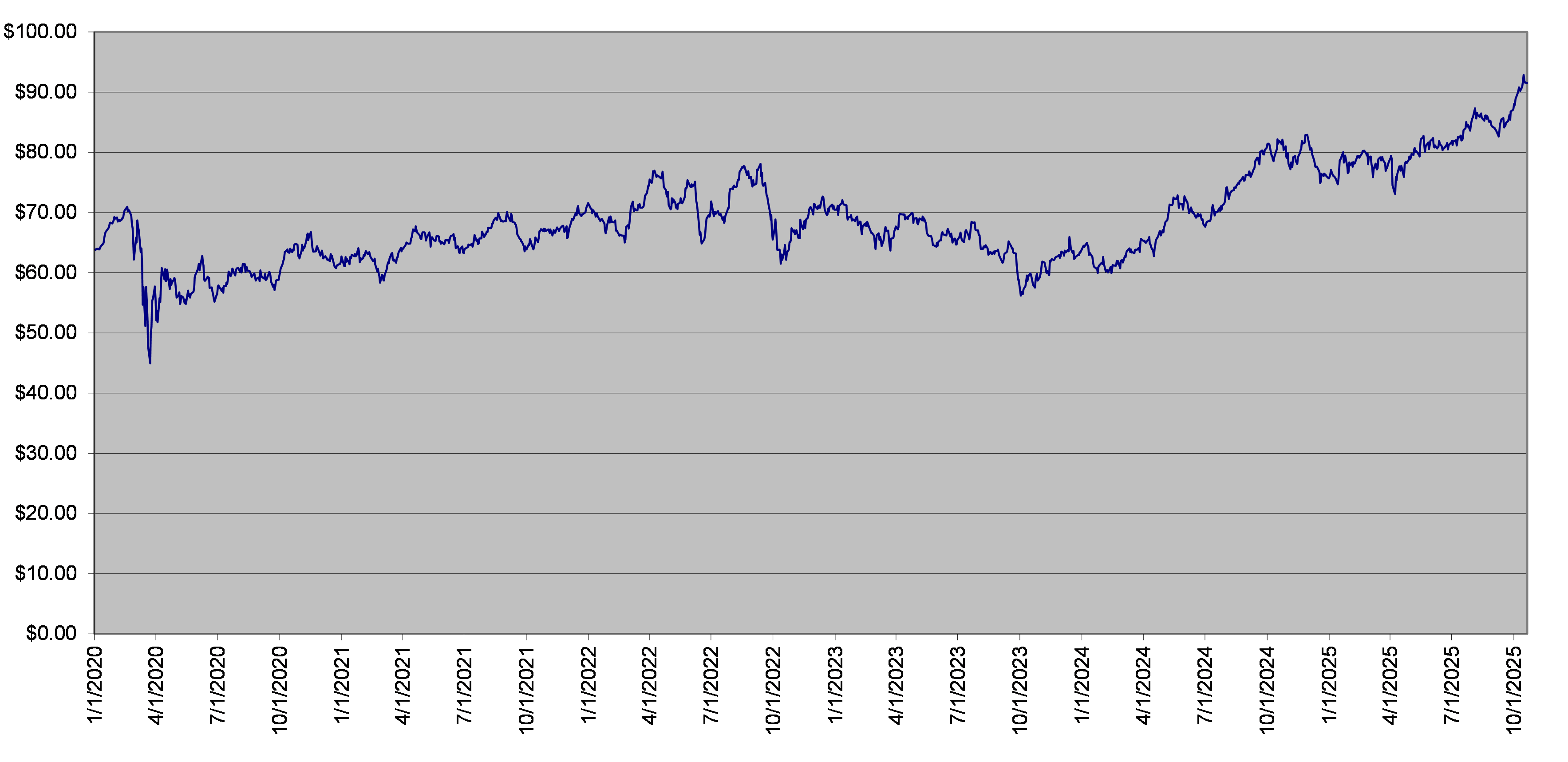XLU Fund Daily Closing Levels January 1, 2020 to October 20, 2025 |