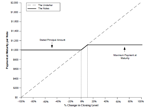 ■Payment at maturity. At maturity, if the final level is greater than the initial level, investors will receive the stated principal amount plus the upside payment, subject to the maximum payment at maturity. If, however, the final level is equal to or less than the initial level, investors will receive only the stated principal amount at maturity.
