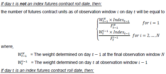 When calculating the cumulative futures contract return, the number of futures contract units in the relevant observation window is calculated based on whether or not such observation window occurs on a day that is five business days prior to the expiry date of the current futures contract (an “index futures contract roll date”).