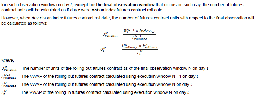 (1)The product of (a) the VWAP of the futures contract calculated using the first execution window on day t minus the VWAP of the futures contract calculated for execution window #7 with respect to the prior index calculation day (day t-1) and (b) the number of futures contract units as of the final observation window on day t-1;
