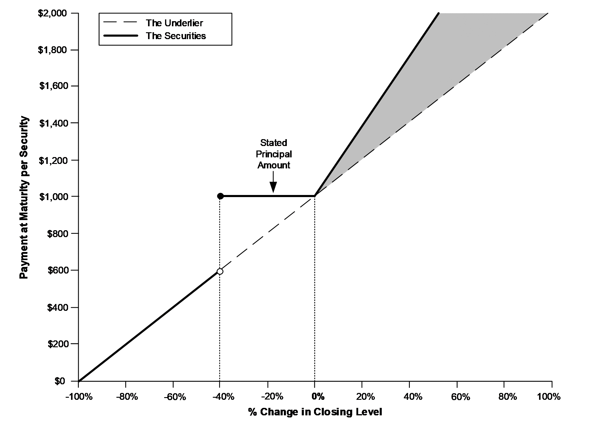 ■Payment at maturity. At maturity, if the final level is greater than the initial level, investors will receive the stated principal amount plus the leveraged upside payment. If the final level is equal to or less than the initial level but is greater than or equal to the downside threshold level, investors will receive only the stated principal amount at maturity. If, however, the final level is less than the downside threshold level, investors will lose 1% for every 1% decline in the level of the underlier over the term of the securities. Under these circumstances, the payment at maturity will be significantly less than the stated principal amount and could be zero.