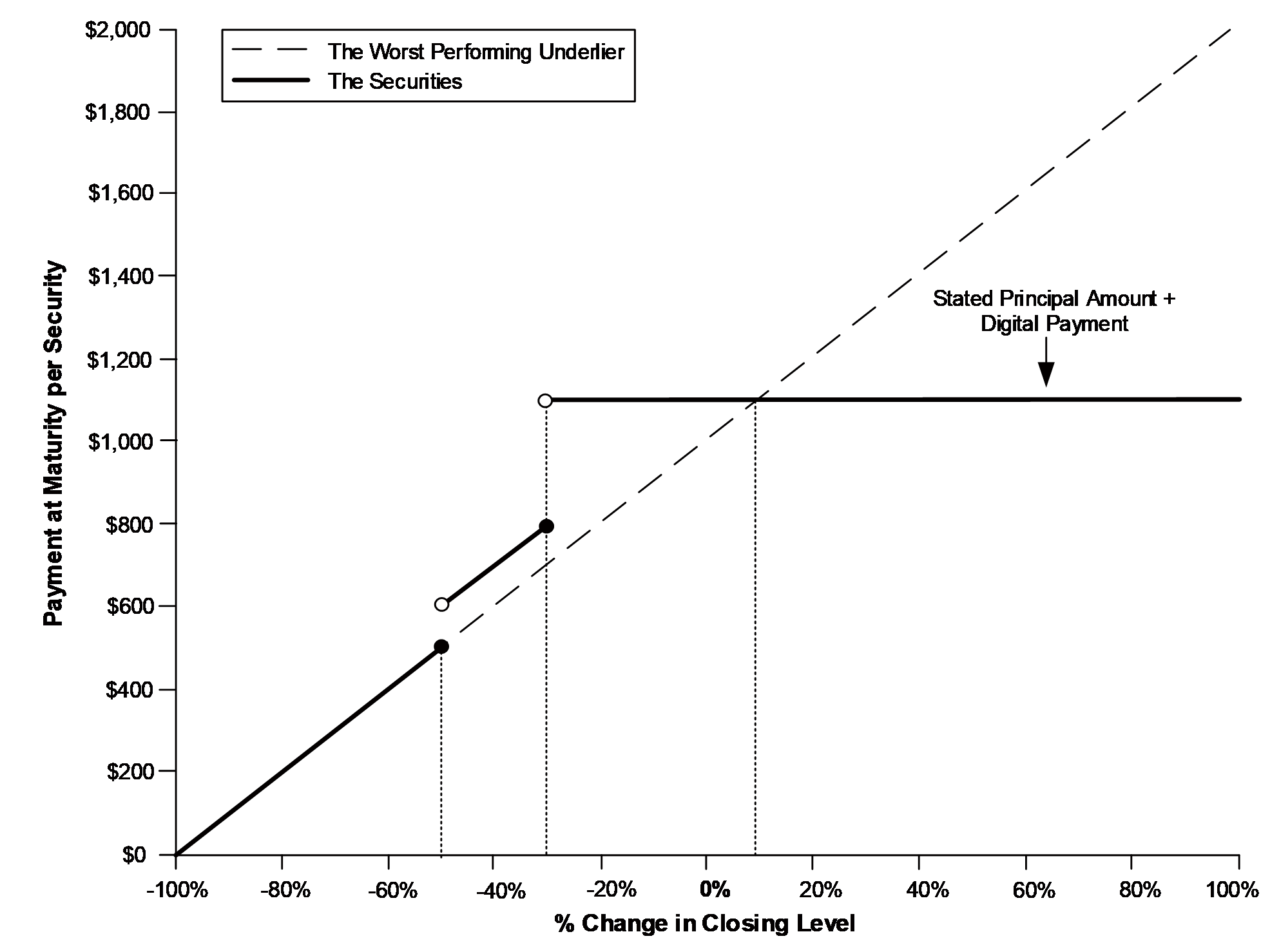 oIf the worst performing underlier depreciates 45%, investors will lose 45% of their principal but receive the digital payment. Investors will receive only $642.50 per security at maturity, or 64.25% of the stated principal amount.