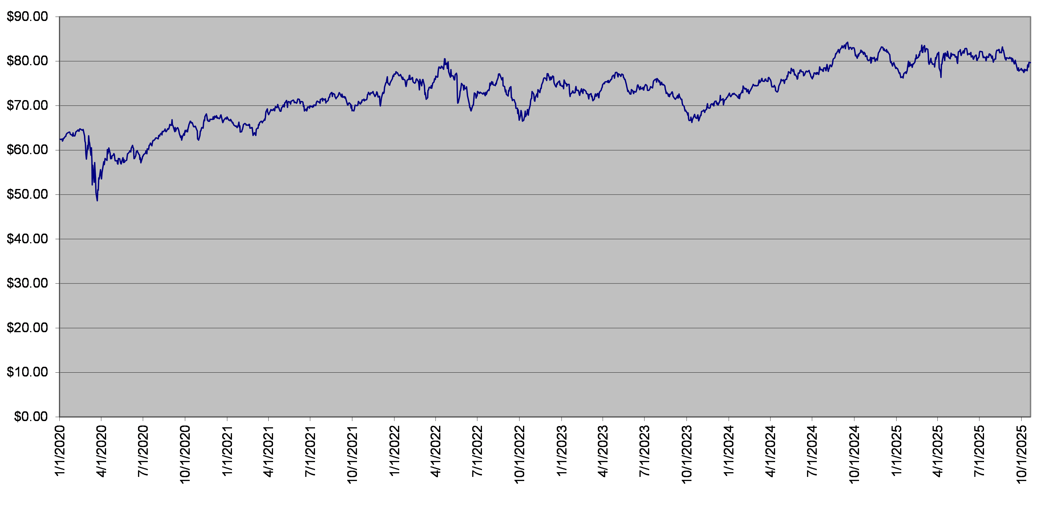 XLP Fund Daily Closing Levels January 1, 2020 to October 20, 2025 |