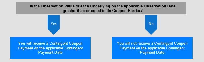 If, on any monthly Observation Date, the Observation Value of each Underlying is greater than or equal to its Coupon Barrier, we will pay a Contingent Coupon Payment of $6.875 per $1,000.00 in principal amount of Notes (equal to a rate of 0.6875% per month or 8.25% per annum) on the applicable Contingent Payment Date (including the Maturity Date). |