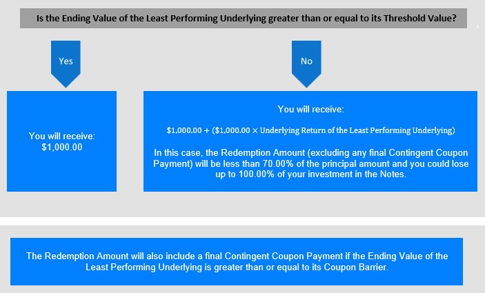 The Redemption Amount will also include a final Contingent Coupon Payment if the Ending Value of the Least Performing Underlying is greater than or equal to its Coupon Barrier. |