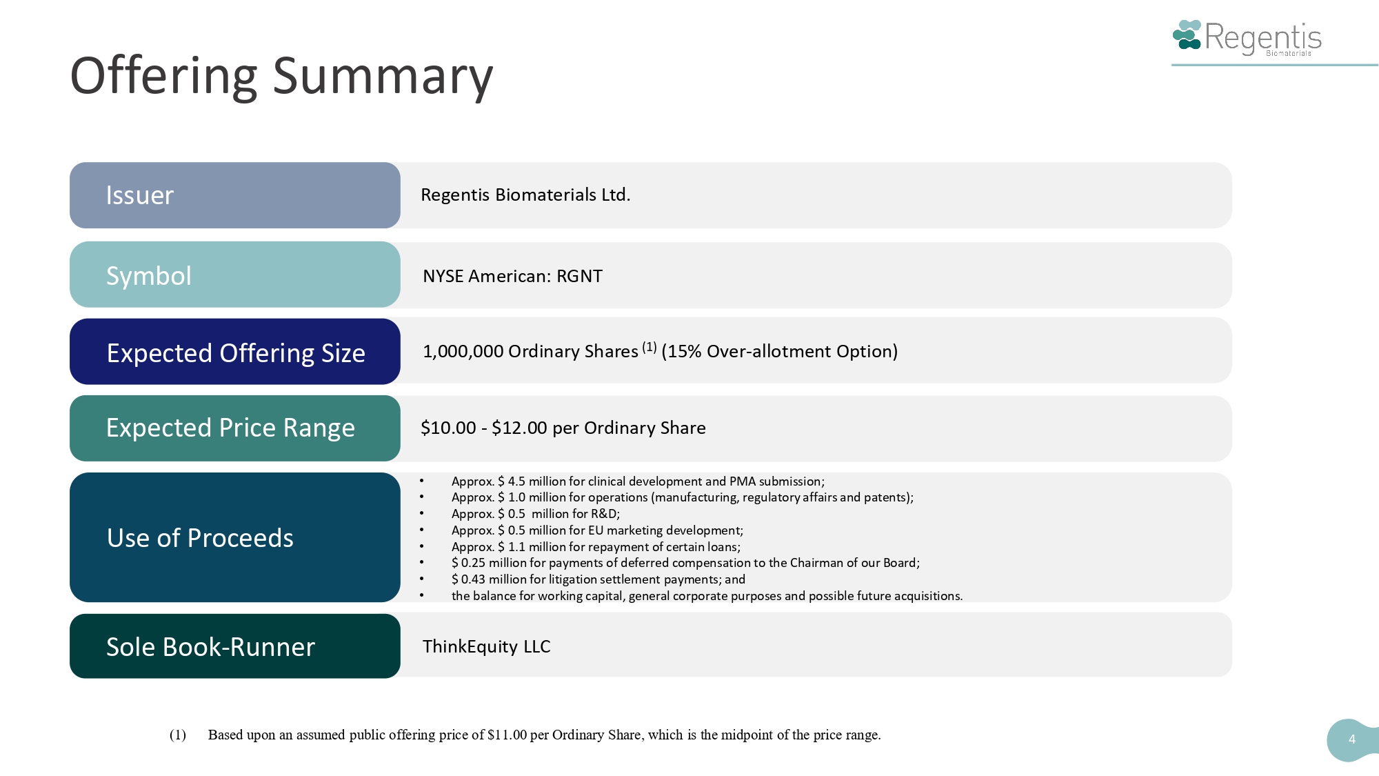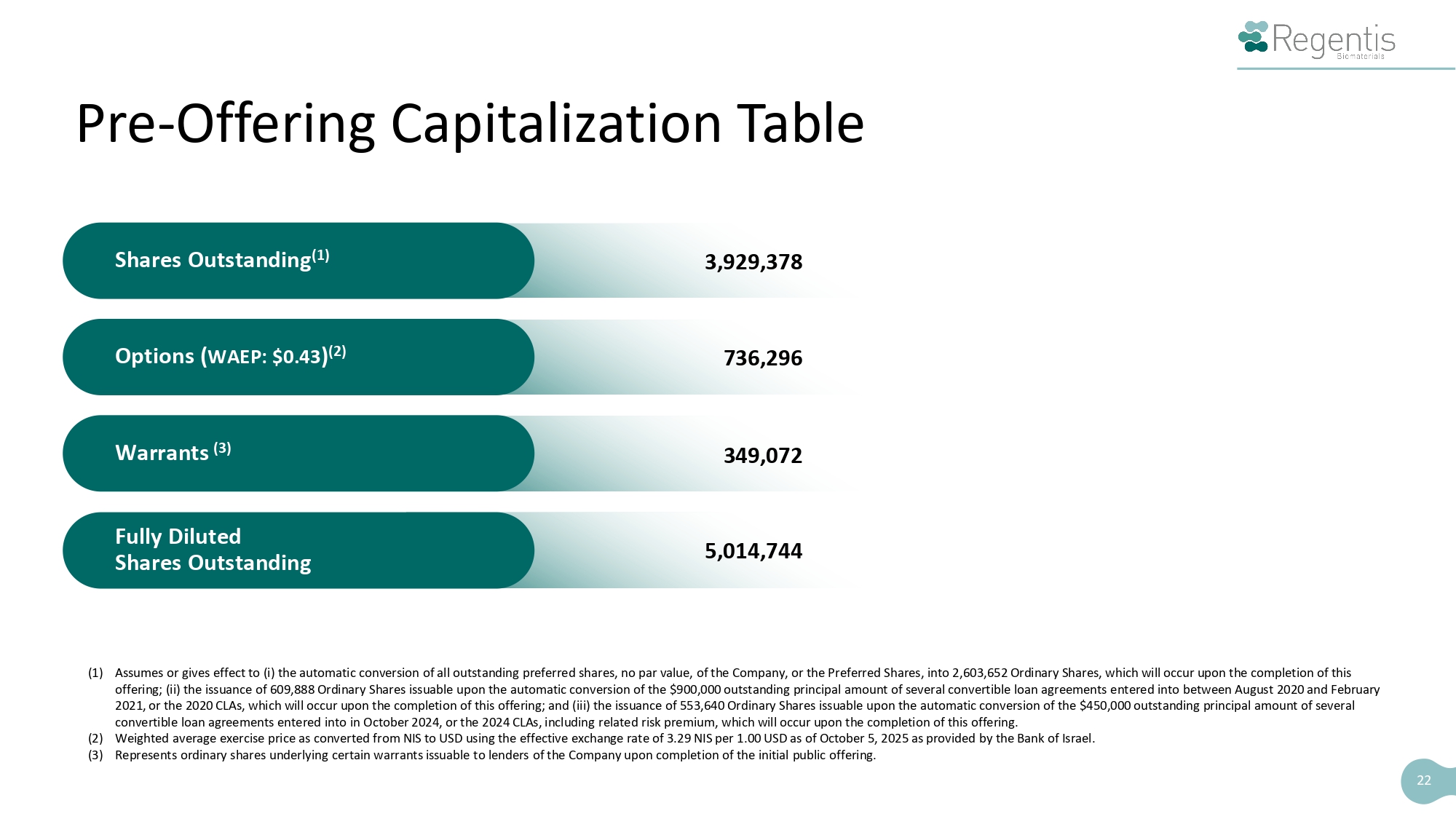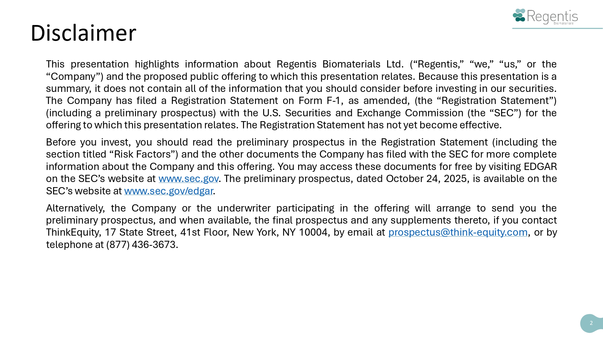 Disclaimer This presentation highlights information about Regentis Biomaterials Ltd . (“Regentis,” “we,” “us,” or the “Company”) and the proposed public offering to which this presentation relates . Because this presentation is a summary, it does not contain all of the information that you should consider before investing in our securities . The Company has filed a Registration Statement on Form F - 1 , as amended, (the “Registration Statement”) (including a preliminary prospectus) with the U . S . Securities and Exchange Commission (the “SEC”) for the offering to which this presentation relates . The Registration Statement has not yet become effective . Before you invest, you should read the preliminary prospectus in the Registration Statement (including the section titled “Risk Factors”) and the other documents the Company has filed with the SEC for more complete information about the Company and this offering . You may access these documents for free by visiting EDGAR on the SEC’s website at www . sec . gov . The preliminary prospectus, dated October 24 , 2025 , is available on the SEC’s website at www . sec . gov/edgar . Alternatively, the Company or the underwriter participating in the offering will arrange to send you the preliminary prospectus, and when available, the final prospectus and any supplements thereto, if you contact ThinkEquity, 17 State Street, 41 st Floor, New York, NY 10004 , by email at prospectus@think - equity . com , or by telephone at ( 877 ) 436 - 3673 . 2