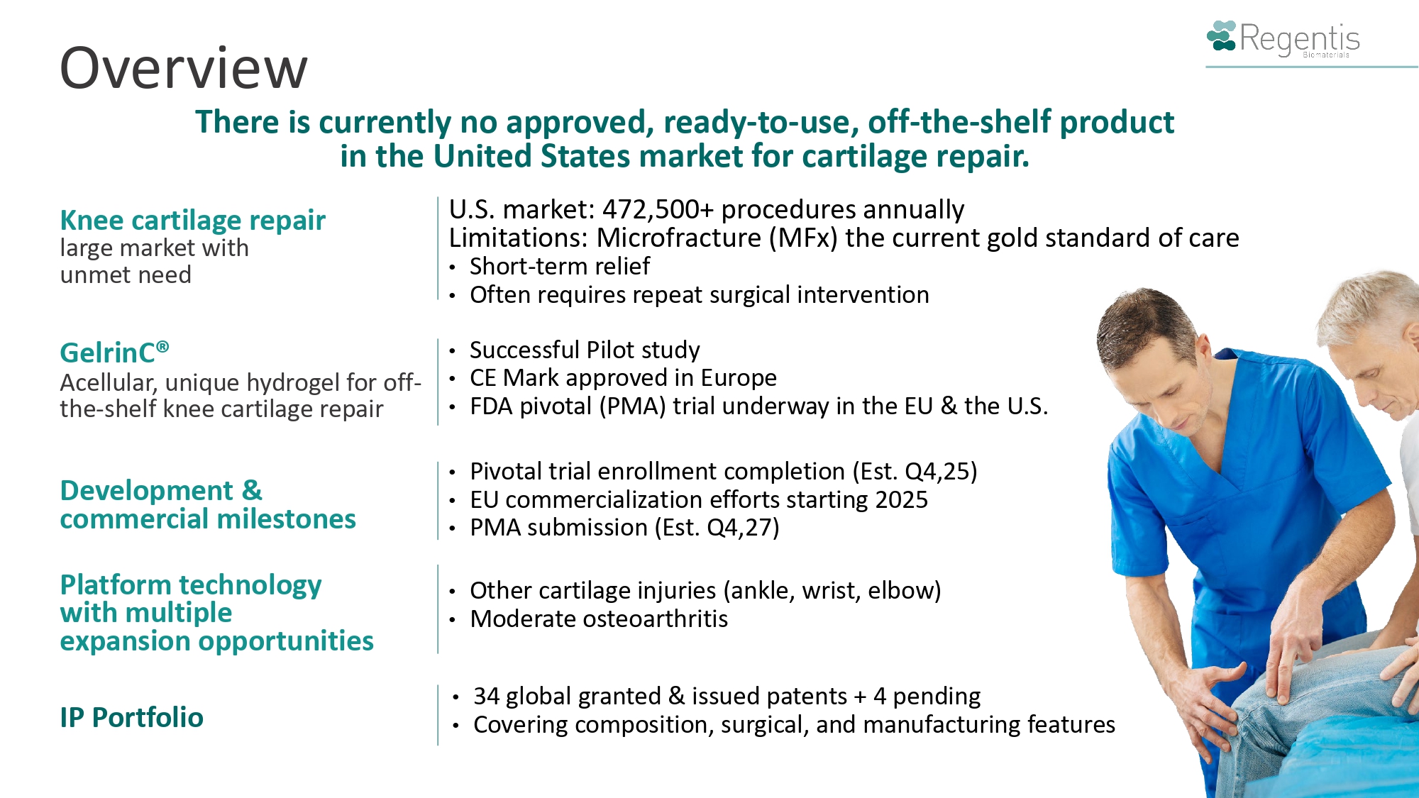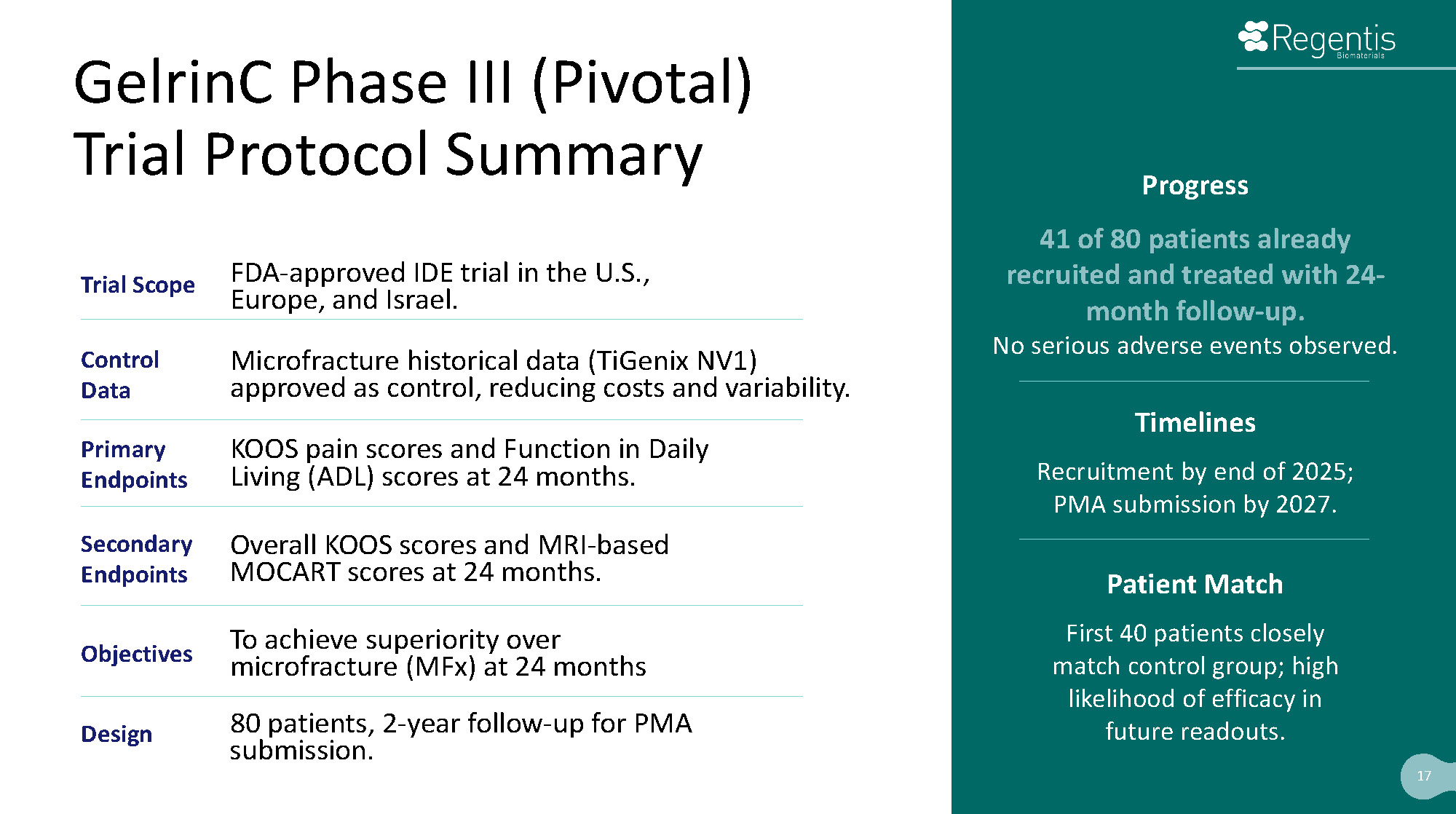 Progress 41 of 80 patients already recruited and treated with 24 - month follow - up. No serious adverse events observed. Timelines Recruitment by 2025; PMA submission by 2027. Patient Match First 40 patients closely match control group; high likelihood of efficacy in future readouts. Trial Scope FDA - approved IDE trial in the U.S., Europe, and Israel. Control Data Microfracture historical data (TiGenix NV1) approved as control, reducing costs and variability. Primary Endpoints KOOS pain scores and Function in Daily Living (ADL) scores at 24 months. Secondary Endpoints Overall KOOS scores and MRI - based MOCART scores at 24 months. Objectives To achieve superiority over microfracture (MFx) at 24 months Design 17 17 80 patients, 2 - year follow - up for PMA submission. GelrinC Phase III (Pivotal) Trial Protocol Summary