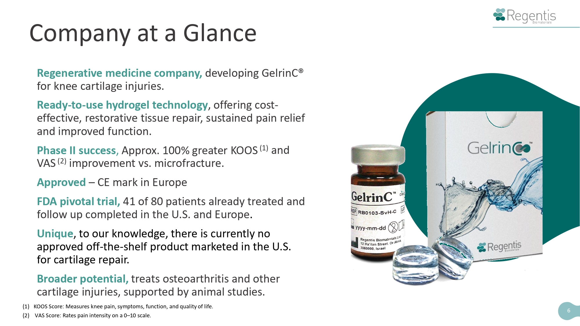 5 Knee cartilage repair large market with unmet need U.S. market: 472,500+ procedures annually Limitations: Microfracture (MFx) the current gold standard of care • Short - term relief • Often requires repeat surgical intervention GelrinC® Acellular, unique hydrogel for off - the - shelf knee cartilage repair • Successful Pilot study • CE Mark approved in Europe • FDA pivotal (PMA) trial underway in the EU & the U.S. Development & commercial milestones • Pivotal trial enrollment completion (Est. Q4,25) • EU commercialization efforts starting 2025 • PMA submission (Est. Q4,27) Platform technology with multiple expansion opportunities • Other cartilage injuries (ankle, wrist, elbow) • Moderate osteoarthritis IP Portfolio • 34 global granted & issued patents + 4 pending • Covering composition, surgical, and manufacturing features Overview There is currently no approved, ready - to - use, off - the - shelf product in the United States market for cartilage repair.