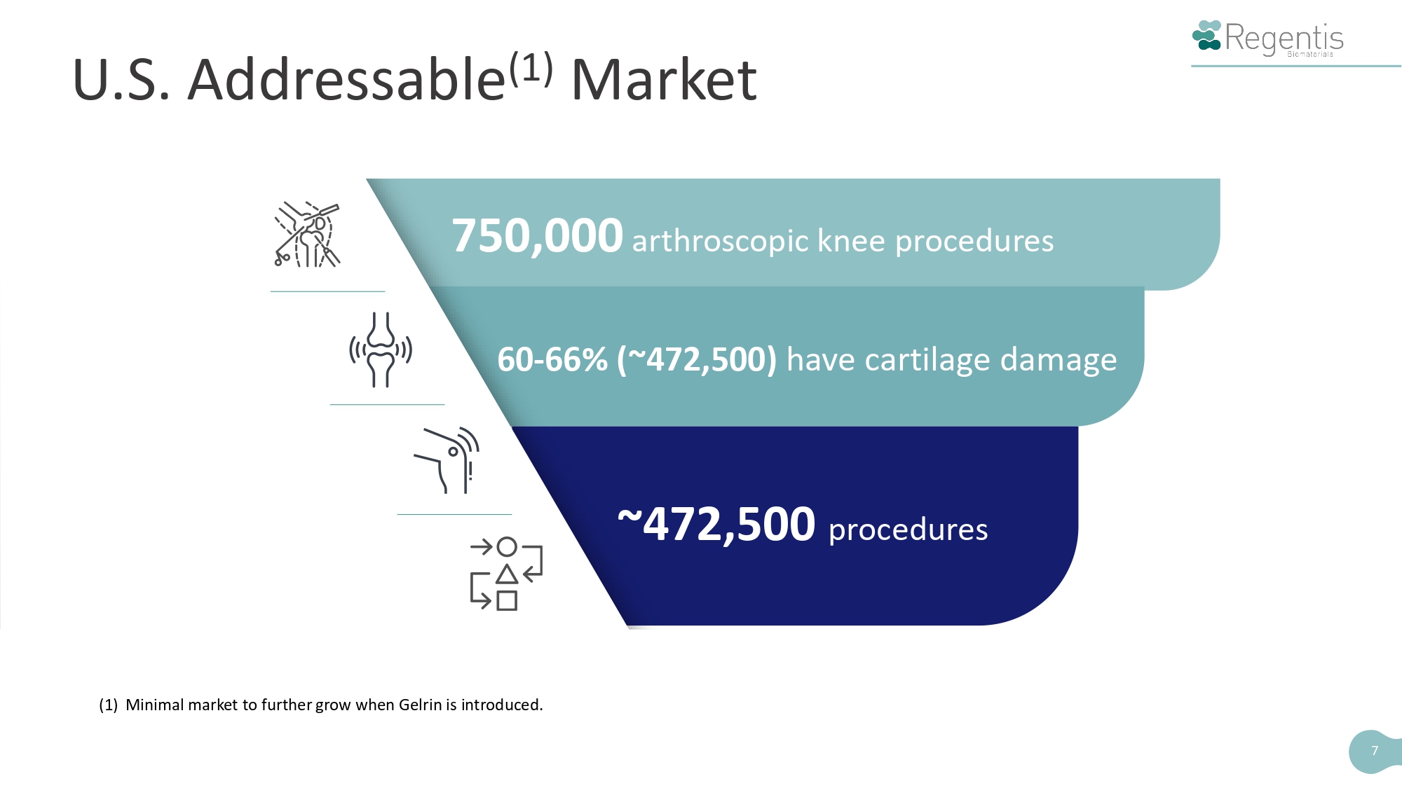 ~472,500 procedures (1) Minimal market to further grow when Gelrin is introduced. U.S. Addressable (1) Market 7 750,000 arthroscopic knee procedures 60 - 66% (~472,500) have cartilage damage