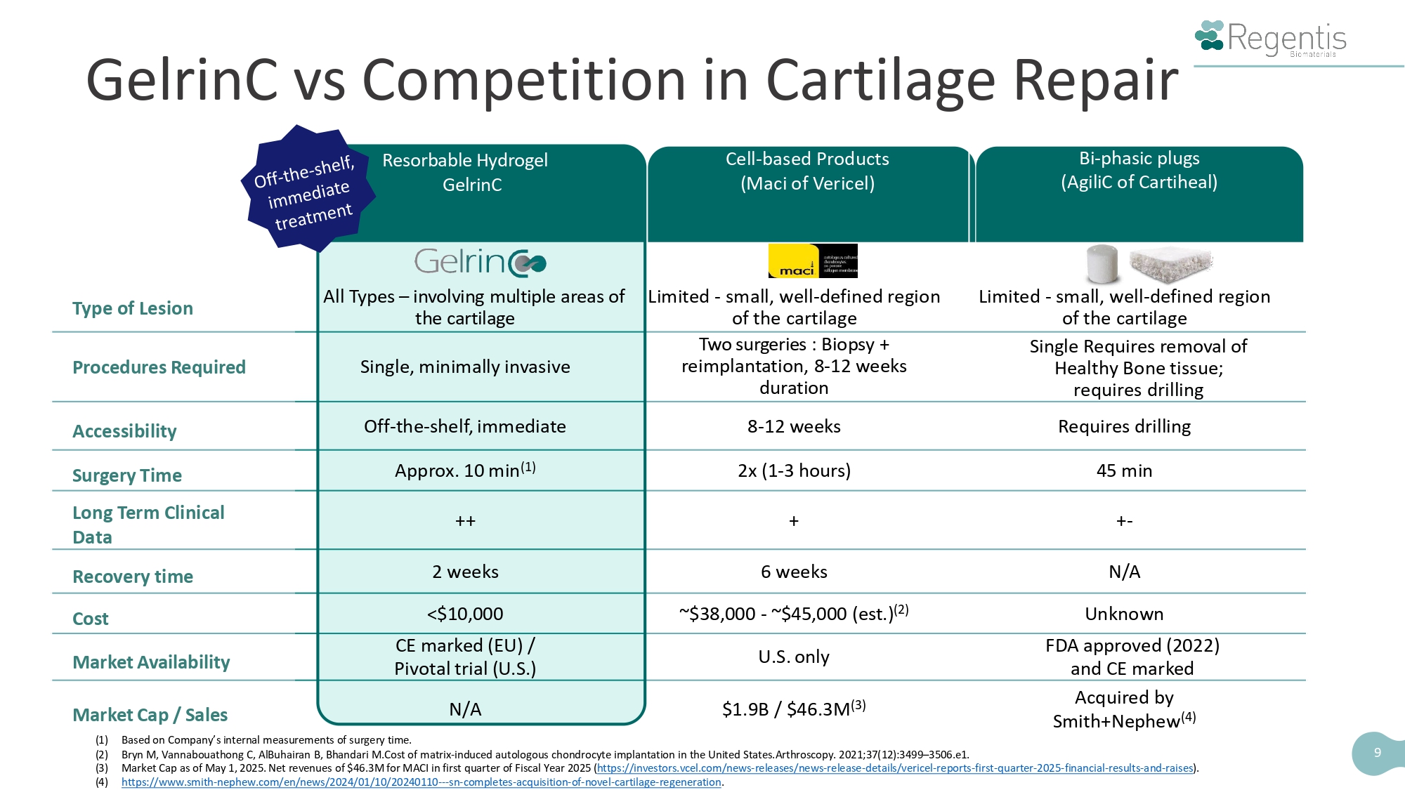 9 Bi - phasic plugs (AgiliC of Cartiheal) Cell - based Products (Maci of Vericel) Resorbable Hydrogel GelrinC Limited - small, well - defined region of the cartilage Limited - small, well - defined region of the cartilage All Types – involving multiple areas of the cartilage Type of Lesion Single Requires removal of Healthy Bone tissue; requires drilling Two surgeries : Biopsy + reimplantation, 8 - 12 weeks duration Single, minimally invasive Procedures Required Requires drilling 8 - 12 weeks Off - the - shelf, immediate Accessibility 45 min 2x (1 - 3 hours) Approx. 10 min (1) Surgery Time + - + ++ Long Term Clinical Data N/A 6 weeks 2 weeks Recovery time Unknown ~$38,000 - ~$45,000 (est.) (2) <$10,000 Cost FDA approved (2022) and CE marked U.S. only CE marked (EU) / Pivotal trial (U.S.) Market Availability Acquired by Smith+Nephew (4) $1.9B / $46.3M (3) N/A Market Cap / Sales GelrinC vs Competition in Cartilage Repair (1) Based on Company’s internal measurements of surgery time. (2) Bryn M, Vannabouathong C, AlBuhairan B, Bhandari M.Cost of matrix - induced autologous chondrocyte implantation in the United States.Arthroscopy. 2021;37(12):3499 – 3506.e1. (3) Market Cap as of May 1, 2025. Net revenues of $46.3M for MACI in first quarter of Fiscal Year 2025 ( https://investors.vcel.com/news - releases/news - release - details/verice l - reports - first - quarter - 2025 - financia l - results - and - raises ). (4) https://www.smith - nephew.com/en/news/2024/01/10/20240110 - - - sn - completes - acquisition - of - nove l - cartilage - regeneration .