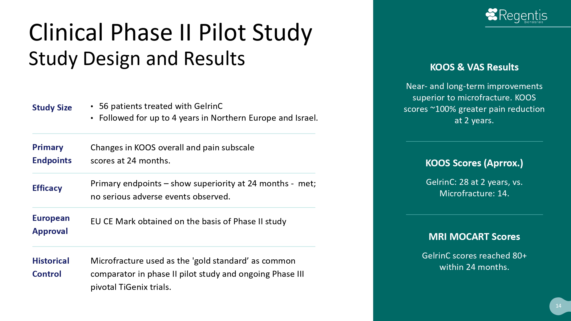 Unique, FDA approved IDE Clinical Protocol Phase II Phase III CE Mark EU Approved FDA Allowed use of Historical Control Tigenix for PMA Clinical Study Study Design Highlights • 80 patients for submission • 47 patients recruited and treated • Balance to follow post - IPO • FDA allowed the use of Historical Control in the unique single - arm protocol. Historical Control Data Package 13 (owned by Regentis)