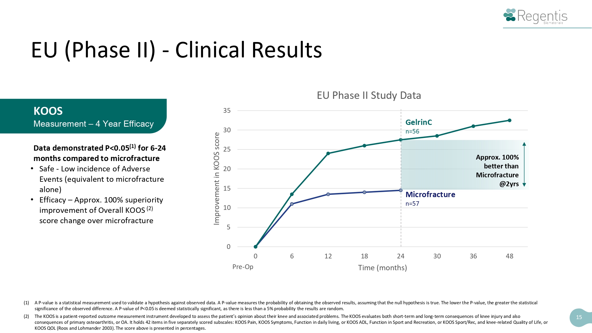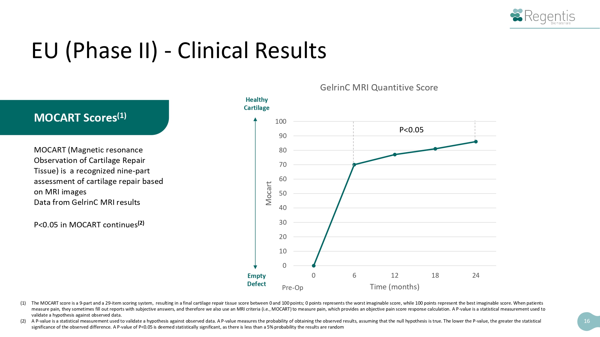 15 EU (Phase II) - Clinical Results KOOS Measurement – 4 Year Efficacy Data demonstrated P<0.05 (1) for 6 - 24 months compared to microfracture • Safe - Low incidence of Adverse Events (equivalent to microfracture alone) • Efficacy – Approx. 100% superiority improvement of Overall KOOS (2) score change over microfracture (1) A P - value is a statistical measurement used to validate a hypothesis against observed data. A P - value measures the probability of obtaining the observed results, assuming that the null hypothesis is true. The lower the P - value, the greater the statistical significance of the observed difference. A P - value of P<0.05 is deemed statistically significant, as there is less than a 5% probability the results are random. (2) The KOOS is a patient - reported outcome measurement instrument developed to assess the patient’s opinion about their knee and associated problems. The KOOS evaluates both short - term and long - term consequences of knee injury and also consequences of primary osteoarthritis, or OA. It holds 42 items in five separately scored subscales: KOOS Pain, KOOS Symptoms, Function in daily living, or KOOS ADL, Function in Sport and Recreation, or KOOS Sport/Rec, and knee - related Quality of Life, or KOOS QOL (Roos and Lohmander 2003). The score above is presented in percentages. 0 5 10 15 20 25 30 35 0 6 12 18 24 Time (months) 30 36 48 Improvement in KOOS score EU Phase II Study Data GelrinC n=56 Microfracture n=57 Approx. 100% better than Microfracture @2yrs Pre - Op
