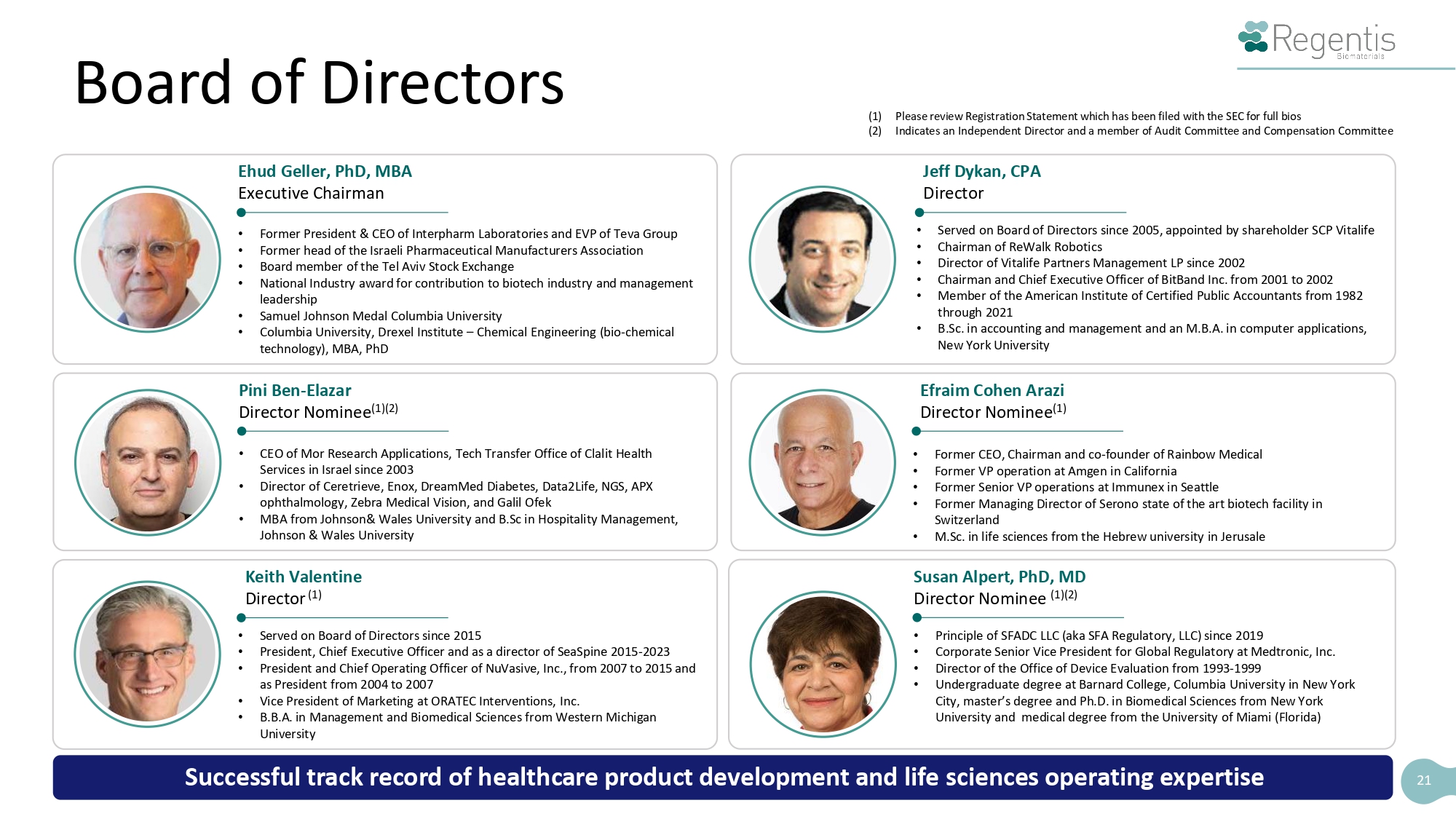 Ehud Geller, PhD, MBA Executive Chairman • Former President & CEO of Interpharm Laboratories and EVP of Teva Group • Former head of the Israeli Pharmaceutical Manufacturers Association • Board member of the Tel Aviv Stock Exchange • National Industry award for contribution to biotech industry and management leadership • Samuel Johnson Medal Columbia University • Columbia University, Drexel Institute – Chemical Engineering (bio - chemical technology), MBA, PhD Jeff Dykan, CPA Director • Served on Board of Directors since 2005, appointed by shareholder SCP Vitalife • Chairman of ReWalk Robotics • Director of Vitalife Partners Management LP since 2002 • Chairman and Chief Executive Officer of BitBand Inc. from 2001 to 2002 • Member of the American Institute of Certified Public Accountants from 1982 through 2021 • B.Sc. in accounting and management and an M.B.A. in computer applications, New York University Keith Valentine Director (1) • Served on Board of Directors since 2015 • President, Chief Executive Officer and as a director of SeaSpine 2015 - 2023 • President and Chief Operating Officer of NuVasive, Inc., from 2007 to 2015 and as President from 2004 to 2007 • Vice President of Marketing at ORATEC Interventions, Inc. • B.B.A. in Management and Biomedical Sciences from Western Michigan University Efraim Cohen Arazi Director Nominee (1) • Former CEO, Chairman and co - founder of Rainbow Medical • Former VP operation at Amgen in California • Former Senior VP operations at Immunex in Seattle • Former Managing Director of Serono state of the art biotech facility in Switzerland • M.Sc. in life sciences from the Hebrew university in Jerusale Susan Alpert, PhD, MD Director Nominee (1)(2) • Principle of SFADC LLC (aka SFA Regulatory, LLC) since 2019 • Corporate Senior Vice President for Global Regulatory at Medtronic, Inc. • Director of the Office of Device Evaluation from 1993 - 1999 • Undergraduate degree at Barnard College, Columbia University in New York City, master’s degree and Ph.D. in Biomedical Sciences from New York University and medical degree from the University of Miami (Florida) (1) Please review Registration Statement which has been filed with the SEC for full bios (2) Indicates an Independent Director and a member of Audit Committee and Compensation Committee Pini Ben - Elazar Director Nominee (1)(2) • CEO of Mor Research Applications, Tech Transfer Office of Clalit Health Services in Israel since 2003 • Director of Ceretrieve, Enox, DreamMed Diabetes, Data2Life, NGS, APX ophthalmology, Zebra Medical Vision, and Galil Ofek • MBA from Johnson& Wales University and B.Sc in Hospitality Management, Johnson & Wales University Board of Directors Successful track record of healthcare product development and life sciences operating expertise 21