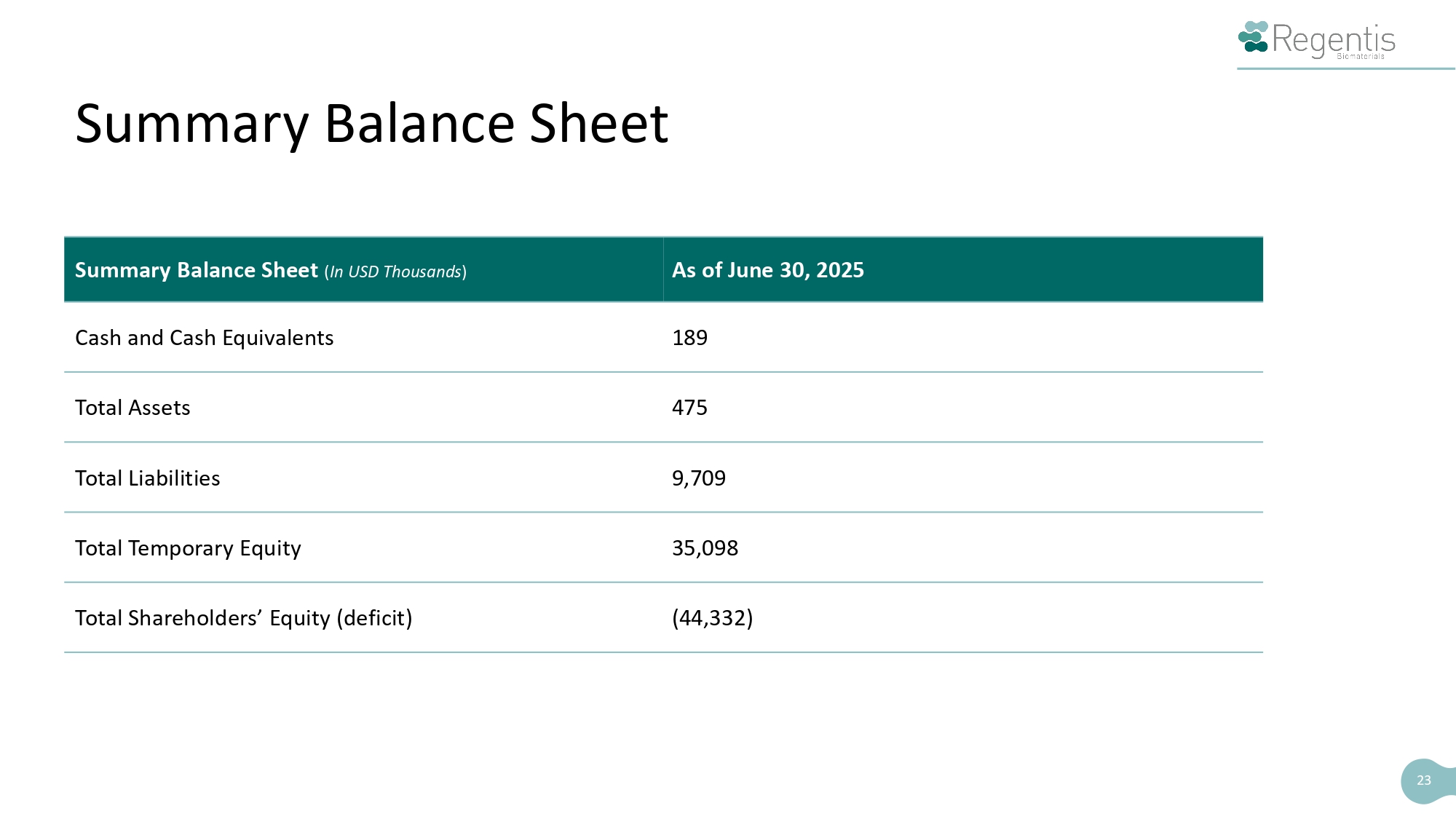 Summary Balance Sheet 23 As of June 30, 2025 Summary Balance Sheet ( In USD Thousands ) 189 Cash and Cash Equivalents 475 Total Assets 9,709 Total Liabilities 35,098 Total Temporary Equity (44,332) Total Shareholders’ Equity (deficit)