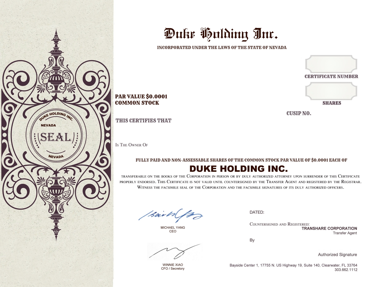 INCORPORATED UNDER THE LAWS OF THE STATE OF NEYADA ' Is THE OWNER Or CER'PIFICA'P£1 NUMBER FULLY PAID AND NON - ASSESSABLE SHARES OF THE COMMON STOCK PAR VALUE OF gO.0001 EACH OF DUKE HOLDING INC. TRANSFERABLE ON THE BOOKS OF THE CORPORATION IN PERSON OR BY DULY AUTHORIZED ATTORNEY UPON SURRENDER OF THIS CERTIFICATE PROPER BY ENDORSED. THIS CERTIFICATE IS NOT VALID UNTIL COUNTERS IGNED BY THE TRANSFER AGENT AND REGISTERED Bv THE ReciS+RAR. WITNESS THE FACSIMILE SEAL OF THE CORPORATION AND THE FACSIMILE SIGNATURES OF ITS DULY AUTHORIZED OFFICERS 87£/utEg . MICHAEL YANG CEO WINNIE XIAO CFO / Secretory DATED: IOUNTERSIGNED AND REGISTERED' TRANSHARE CORPORATION Transfer Agent By Authorized Signature Bayside Center 1, 17755 N. US Highway 19, Suite 140, Clearwater, FL 33764 303.662.1112