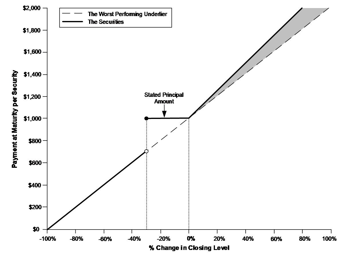 The payoff diagram and table below illustrate the payment at maturity for a range of hypothetical performances of the underlier over the term of the securities.