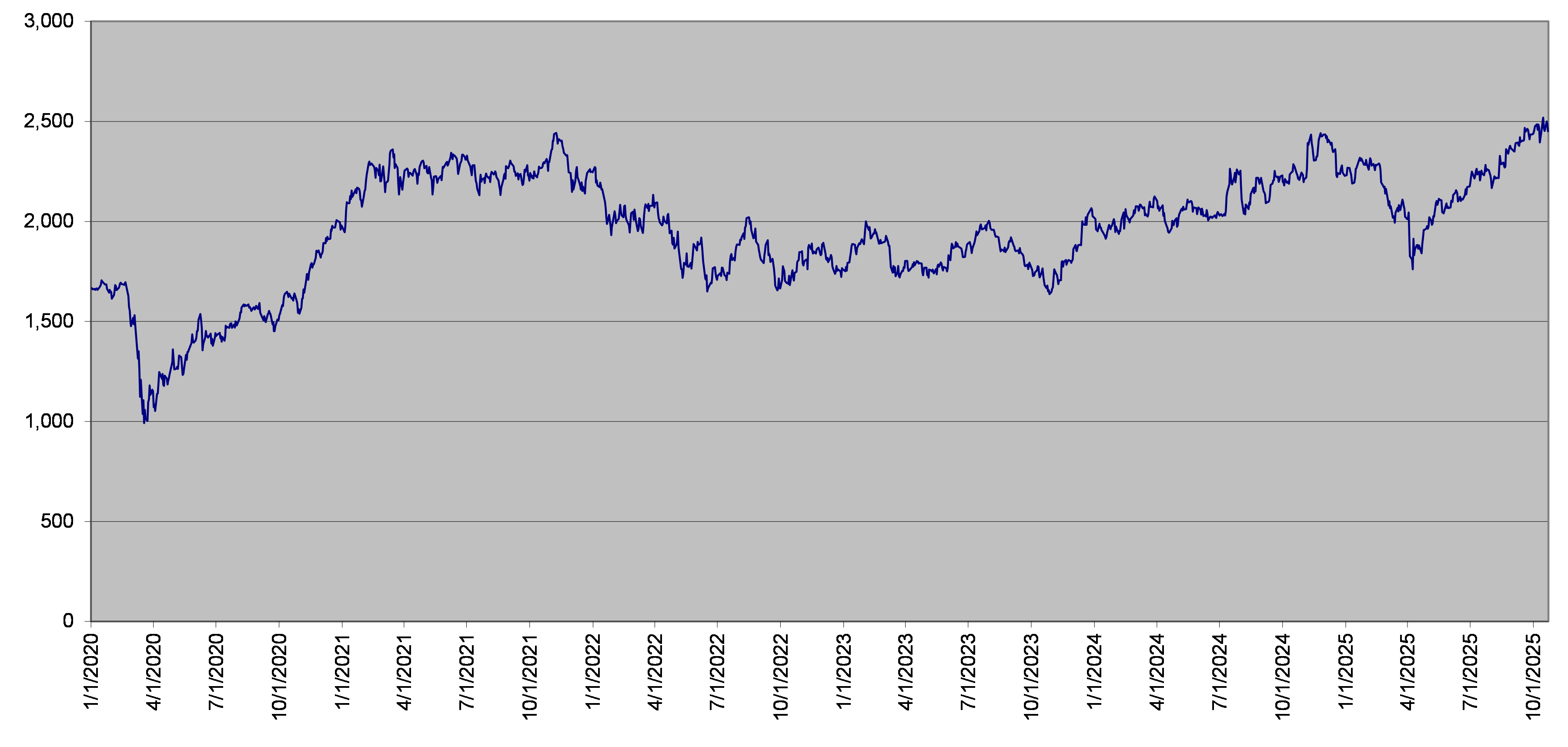 | RTY Index Daily Closing Levels January 1, 2020 to October 22, 2025 |