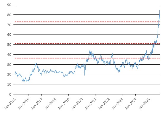 The graph below illustrates the performance of the GDX Fund’s shares from January 1, 2015 through October 24, 2025, based on the daily closing levels as reported by Bloomberg, without independent verification. UBS has not conducted any independent review or due diligence of any publicly available information obtained from Bloomberg. The closing level of the GDX Fund’s shares on October 24, 2025 was $72.80. The dotted lines respectively represent its call threshold level of $72.80, which is equal to 100.00% of its initial level, its coupon barrier of $50.96, which is equal to 70.00% of its initial level, and its downside threshold of $36.40, which is equal to 50.00% of its initial level. Past performance of the underlying asset is not indicative of the future performance of the underlying asset during the term of the Notes.