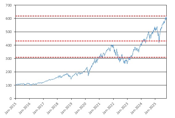 The graph below illustrates the daily performance of the underlying assets from January 1, 2015 through October 24, 2025. For comparison purposes, each underlying asset has been normalized to have a closing level of 100.00 on January 1, 2015 by dividing the closing level of that underlying asset on each trading day by the closing level of that underlying asset on January 1, 2015 and multiplying by 100.00. We obtained the closing levels used to determine the normalized closing levels set forth below from Bloomberg, without independent verification.