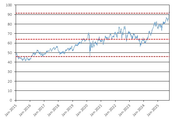 The graph below illustrates the performance of the XLU Fund’s shares from January 1, 2015 through October 24, 2025, based on the daily closing levels as reported by Bloomberg, without independent verification. UBS has not conducted any independent review or due diligence of any publicly available information obtained from Bloomberg. The closing level of the XLU Fund’s shares on October 24, 2025 was $91.39. The dotted lines respectively represent its call threshold level of $91.39, which is equal to 100.00% of its initial level, its coupon barrier of $63.97, which is equal to 70.00% of its initial level, and its downside threshold of $45.70, which is equal to 50.00% of its initial level. Past performance of the underlying asset is not indicative of the future performance of the underlying asset during the term of the Notes.