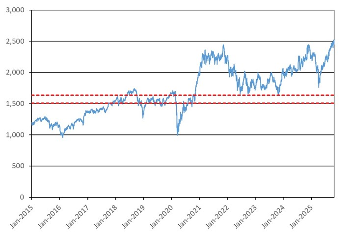 The graph below illustrates the performance of RTY from January 1, 2015 through October 24, 2025, based on the daily closing levels as reported by Bloomberg, without independent verification. UBS has not conducted any independent review or due diligence of any publicly available information obtained from Bloomberg. The closing level of RTY on October 24, 2025 was 2,513.470. The dotted lines represent its coupon barrier of 1,633.756, which is equal to 65.00% of its initial level, and its downside threshold of 1,508.082, which is equal to 60.00% of its initial level. Past performance of the underlying asset is not indicative of the future performance of the underlying asset during the term of the Notes.