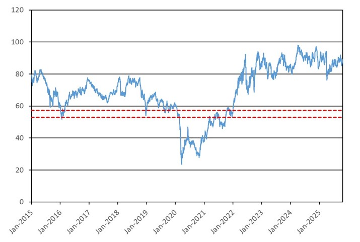 The graph below illustrates the performance of the XLE Fund’s shares from January 1, 2015 through October 24, 2025, based on the daily closing levels as reported by Bloomberg, without independent verification. UBS has not conducted any independent review or due diligence of any publicly available information obtained from Bloomberg. The closing level of the XLE Fund’s shares on October 24, 2025 was $88.07. The dotted lines represent its coupon barrier of $57.25, which is equal to 65.00% of its initial level, and its downside threshold of $52.84, which is equal to 60.00% of its initial level. Past performance of the underlying asset is not indicative of the future performance of the underlying asset during the term of the Notes.