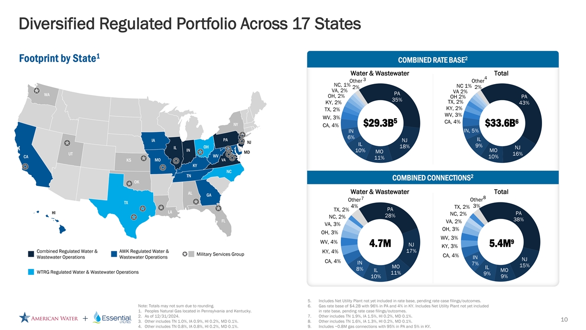 Highly Attractive Footprint with Scale and Scope for Growth Top 12 States by Combined 2024A Water & Wastewater Rate Base AMERICAN WATER + ESSENTIAL CA PA MO IL IN 1 2 NJ $34B $41B 2024A Rate Base 2026E Rate Base $10.4B $5.3B $3.2B $3.0B $1.8B $1.2B 3 $40B Market Capitalization NC TX KY OH VA WV 4 17 5.4M + $0.9B $0.7B $0.6B $0.6B $0.5B $0.4B Regulated States U.S. Connections AWK + WTRG AWK WTRG 1. Includes gas rate base of $4.2B and Net Utility Plant not yet included in rate base, pending rate case filings/outcomes. 2. Includes gas rate base of $5.2B and ~$378M in regulated growth (BD) and topside. 9 3. As of 10/24/2025. 4. Includes ~0.8M gas connections in PA and KY as of 12/31/2024.