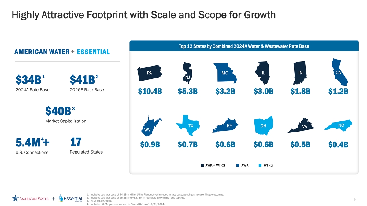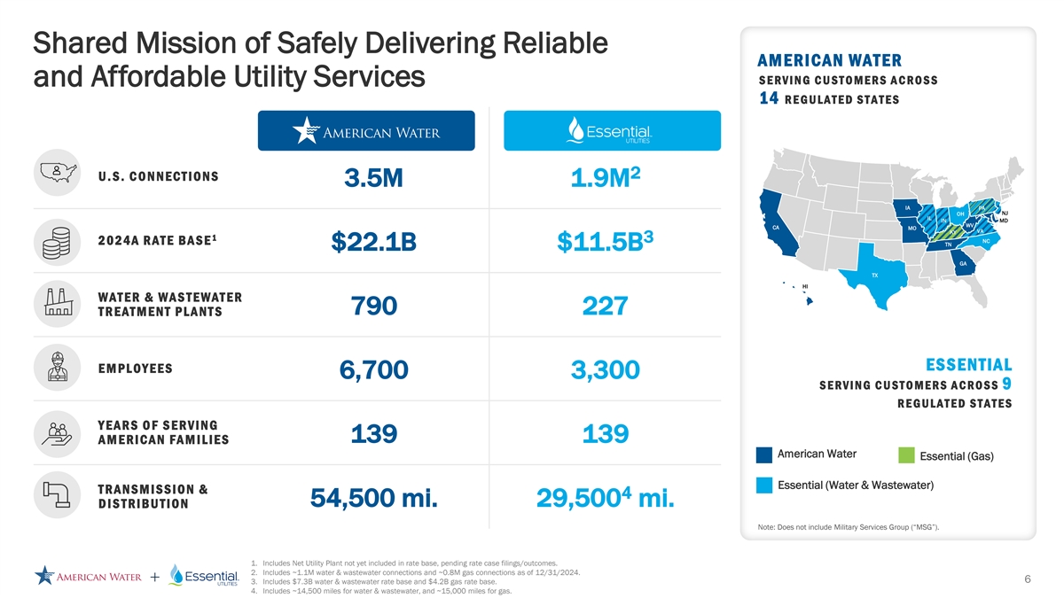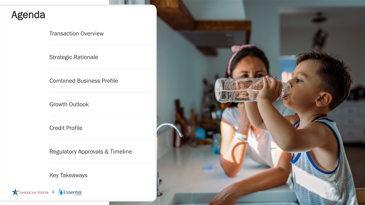 Forward Looking Statements Disclosure Cautionary Statement Regarding Forward-Looking Statements Certain statements included in this communication are forward-looking statements within the meaning of Section 27A of the Securities Act of 1933, as amended, Section 21E of the Securities Exchange Act of 1934, as amended, and the Private Securities Litigation Reform Act of 1995. In some cases, these forward-looking statements can be identified by words with prospective meanings such as “intend,” “plan,” “estimate,” “believe,” “anticipate,” “expect,” “predict,” “project,” “propose,” “assume,” “forecast,” “outlook,” “future,” “pending,” “goal,” “objective,” “potential,” “continue,” “seek to,” “may,” “can,” “will,” “should” and “could,” or the negative of such terms or other variations or similar expressions. Forward-looking statements may relate to, among other things: statements about the benefits of the proposed merger, including future financial and operating results; the parties’ respective plans, objectives, expectations and intentions; the expected timing and likelihood of completion of the merger and related transactions; the results of any strategic review; expected synergies of the proposed merger; the timing and result of various regulatory proceedings related to the proposed merger, and other general rate cases, filings for infrastructure surcharges and other governmental agency authorizations and proceedings, and filings to address regulatory lag; the combined company’s ability to execute its current and long-term business, operational, capital expenditures and growth plans and strategies; the amount, allocation and timing of projected capital expenditures and related funding requirements; the future impacts of increased or increasing transaction and financing costs associated with the proposed merger or otherwise, as well as inflation and interest rates; each party’s ability to finance current and projected operations, capital expenditure needs and growth initiatives by accessing the debt and equity capital markets and sources of short-term liquidity; impacts of the proposed merger on the future settlement or settlements of a party’s forward sale agreements, including potential adjustments to the forward sale price or other economic terms thereunder, and the amount of and the intended use of net proceeds from any such future settlement or settlements; the outcome and impact on other governmental and regulatory investigations; the filing of class action lawsuits and other litigation and legal proceedings related to the proposed merger; the ability to complete, and the timing and efficacy of, the design, development, implementation and improvement of technology and other strategic initiatives; each party’s ability to comply with new and changing environmental regulations; regulatory, legislative, tax policy or legal developments; and impacts that future significant tax legislation may have on each such party and on its business, results of operations, cash flows and liquidity. These forward-looking statements are predictions based on currently available information, the parties’ current respective expectations and assumptions regarding future events that American Water Works Company, Inc. (“American Water”) and Essential Utilities, Inc. (“Essential Utilities”) believe to be reasonable. They are not, however, guarantees or assurances of any outcomes, performance or achievements, and readers are cautioned not to place undue reliance upon them. You should not regard any forward-looking statement as a representation or warranty by American Water, Essential Utilities or any other person that the expectation, plan or objective expressed in such forward-looking statement will be successfully achieved in any specified time frame, or at all. The forward-looking statements are subject to a number of estimates and assumptions, and known and unknown risks, uncertainties and other factors. Actual results may differ materially from those discussed in the forward-looking statements included in this communication as a result of the factors discussed in American Water’s Annual Report on Form 10-K for the year ended December 31, 2024, as filed with the Securities and Exchange Commission (the “SEC”) on February 19, 2025 (available at: ir.amwater.com), Essential Utilities’ Annual Report on Form 10-K for the year ended December 31, 2024, as filed with the SEC on February 27, 2025 (available at: essential.co), and each party’s other filings with the SEC, and additional risks and uncertainties, including with respect to (1) the parties’ ability to consummate the proposed merger pursuant to the terms of the definitive merger agreement or at all; (2) the ability to timely or at all obtain the requisite shareholder approvals with respect to each party; (3) each party’s requirement to obtain required governmental and regulatory approvals required for the proposed merger (and/or that such approvals may result in the imposition of burdensome or commercially undesirable conditions, including required dispositions, that could adversely affect the combined company or the expected benefits of the proposed merger); (4) an event, change or other circumstance that could give rise to the termination of the merger agreement; (5) the failure to satisfy or waive a condition to closing of the proposed merger on a timely basis or at all; (6) a delay in the timing to consummate the proposed merger; (7) the failure to integrate the parties’ businesses successfully; (8) the failure to fully realize cost savings and any other synergies from the proposed merger or that such benefits may take longer to realize than expected; (9) negative or adverse impacts of the announcement of the proposed merger on the market price of American Water’s or Essential Utilities’ common stock; (10) the risk of litiga