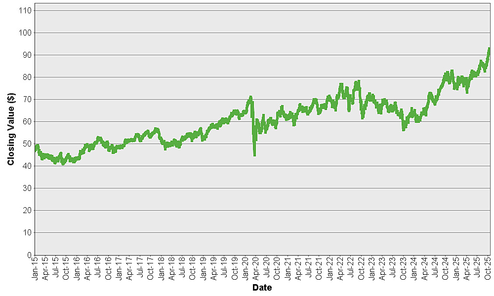 The graph below shows the closing value of the Utilities Select Sector SPDR® Fund for each day such value was available from January 2, 2015 to October 23, 2025. We obtained the closing values from Bloomberg L.P., without independent verification. You should not take historical closing values as an indication of future performance.