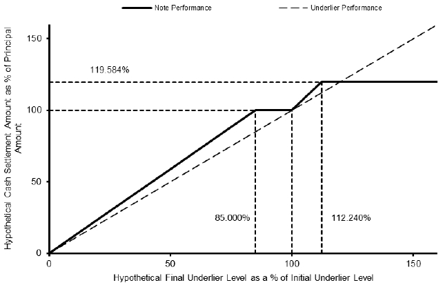 The following chart shows a graphical illustration of the hypothetical cash settlement amounts (expressed as percentages of the principal amount of your notes) that we would pay on your notes on the stated maturity date, if the final underlier level (expressed as percentages of the initial underlier level) were any of the hypothetical levels shown on the horizontal axis. The chart shows that any hypothetical final underlier level of less than 85.000% (the section left of the 85.000% marker on the horizontal axis) would result in a hypothetical cash settlement amount of less than 100.000% of the principal amount of your notes (the section below the 100.000% marker on the vertical axis) and, accordingly, in a loss of principal to the holder of the notes. The chart also shows that any hypothetical final underlier level of greater than or equal to 112.240% (the section right of the 112.240% marker on the horizontal axis) would result in a capped return on your investment.