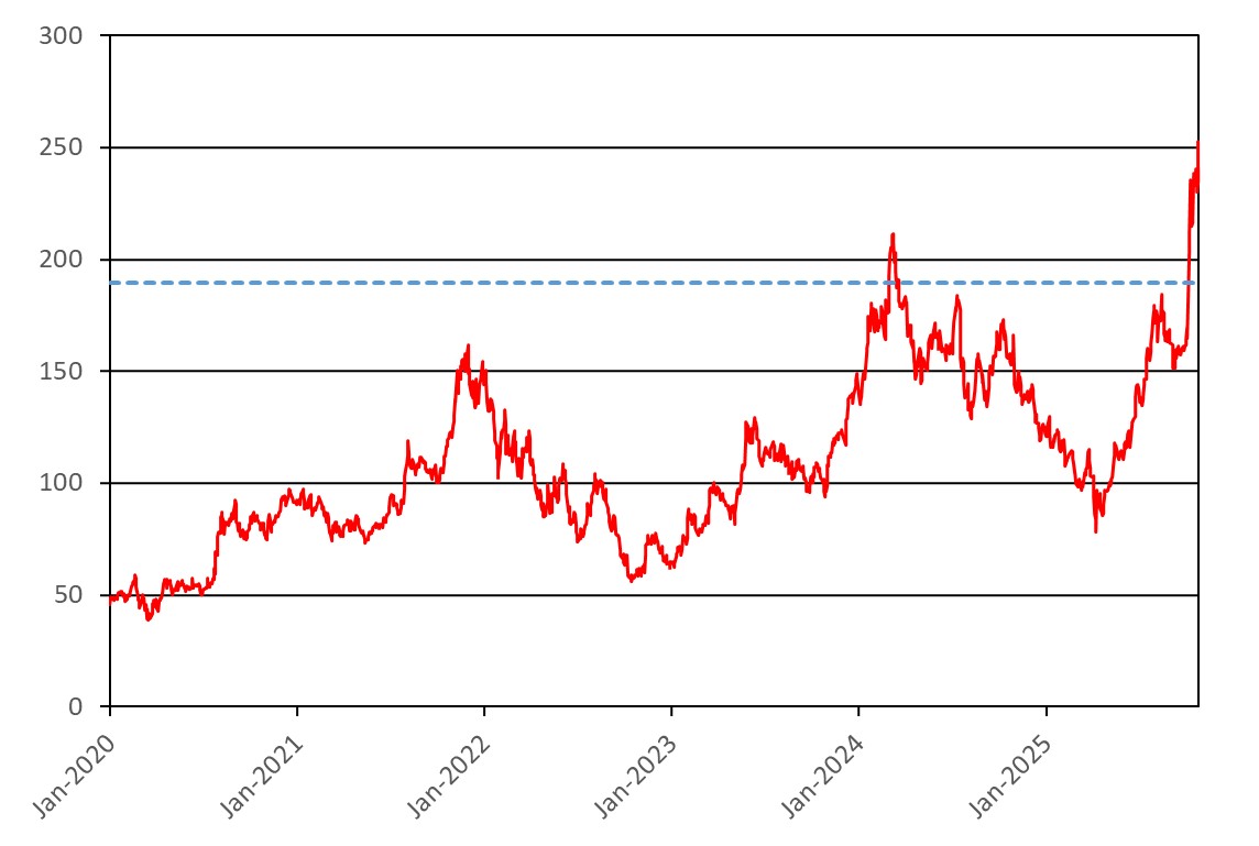 We obtained the information regarding the historical performance of the Reference Asset in the graph below from Bloomberg, without independent review or verification. The graph below illustrates the performance of the Reference Asset from January 1, 2020 through October 24, 2025. The Closing Value of the Reference Asset on the Trade Date was $252.92. The dotted line represents the Contingent Coupon Barrier Value and Buffer Value of $189.69, which is equal to 75.00% of the Initial Value.