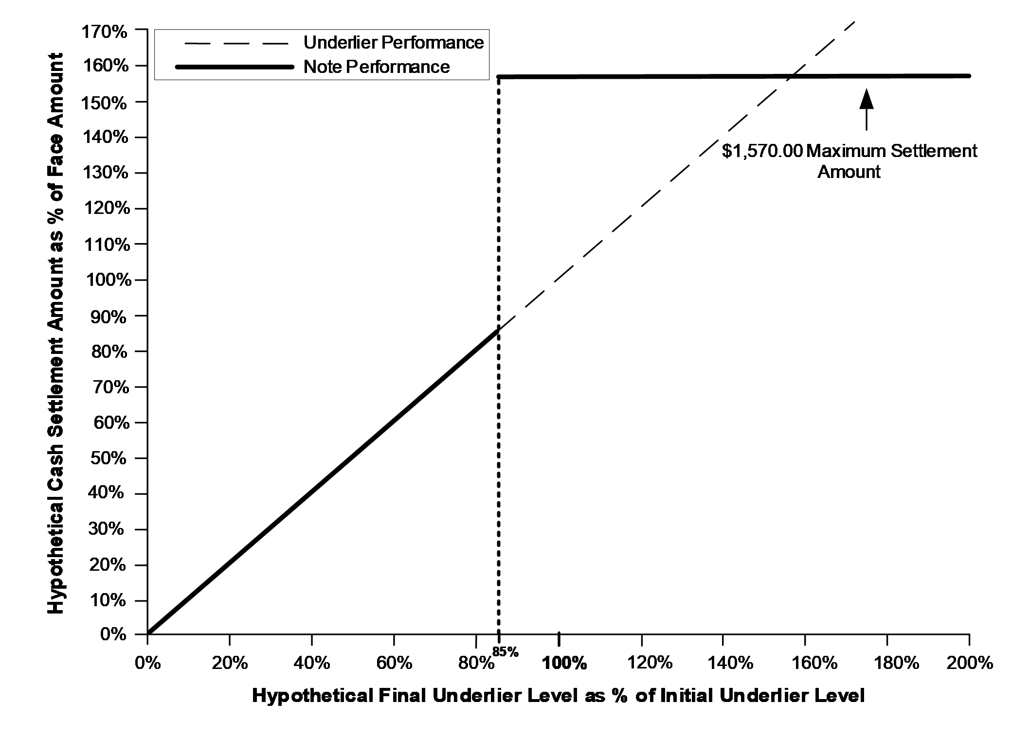 ●if the underlier return is greater than or equal to -15% (the final underlier level is greater than or equal to 85% of the initial underlier level), the maximum settlement amount of $1,570.00 per note, or 157.00% of the face amount; or