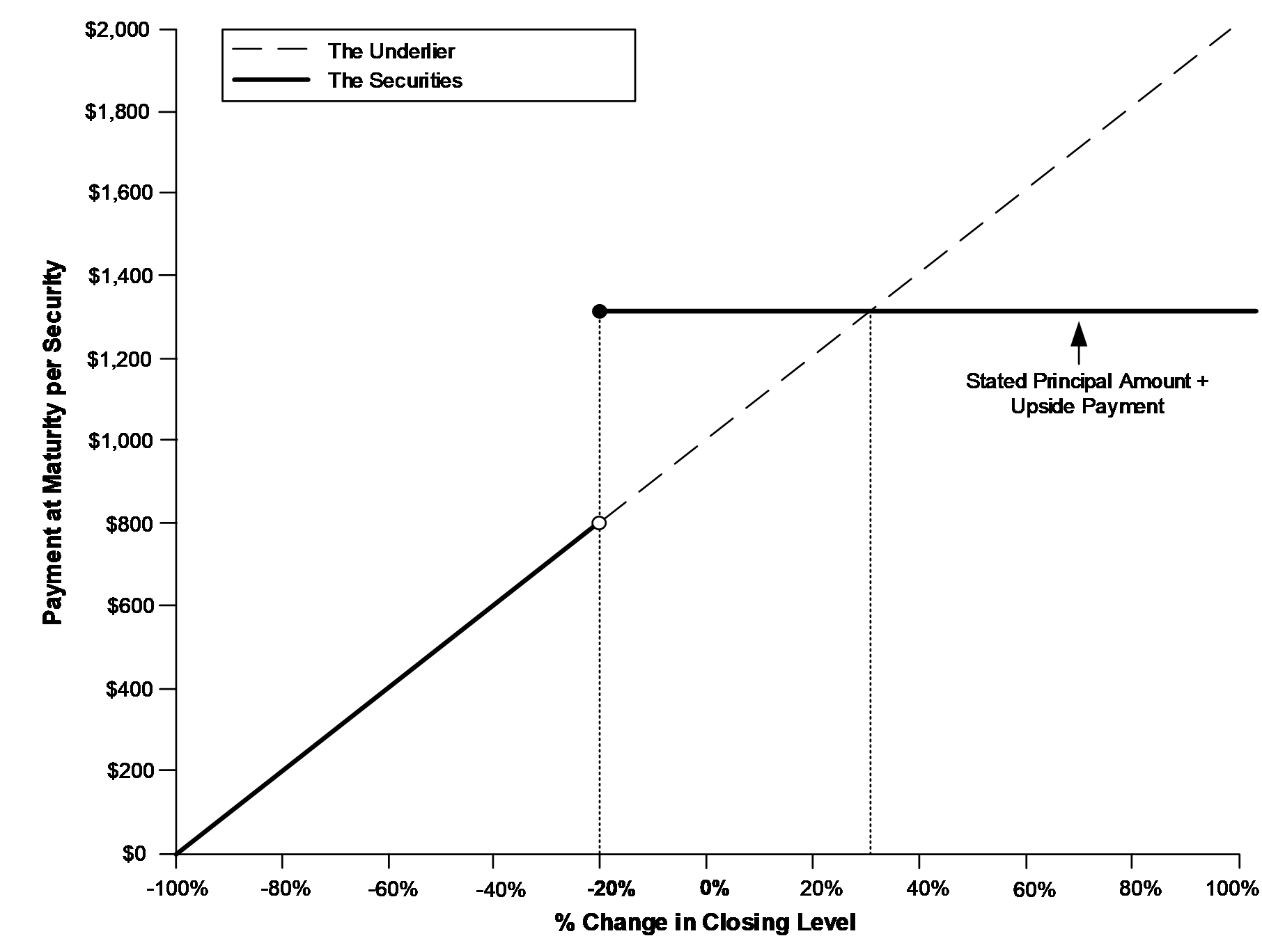 ■Payment at maturity. At maturity, if the final level is greater than or equal to the downside threshold level, investors will receive the stated principal amount plus the upside payment specified herein. If, however, the final level is less than the downside threshold level, investors will lose 1% for every 1% decline in the level of the underlier over the term of the securities. Under these circumstances, the payment at maturity will be significantly less than the stated principal amount and could be zero.