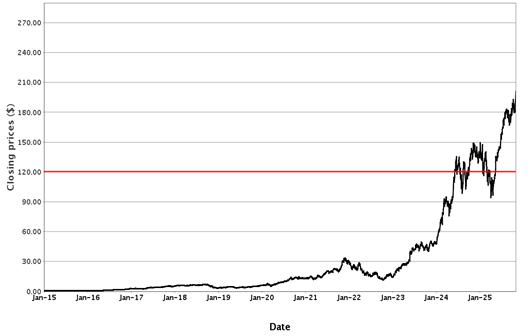 The following graph sets forth historical closing values of the Underlier for the period from January 1, 2015 to October 28, 2025. The red line represents the Coupon Threshold and Barrier Value. We obtained the information in the graph from Bloomberg Financial Markets, without independent investigation. We cannot give you assurance that the performance of the Underlier will result in the return of all of your initial investment.