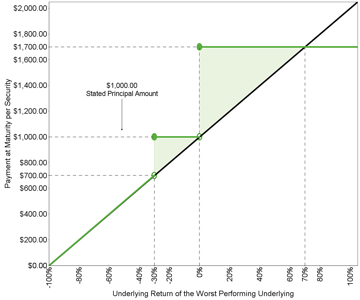 ▪The securities offer the potential for automatic early redemption at a premium following the first valuation date (other than the final valuation date) on which the closing value of the worst performing underlying on that valuation date is greater than or equal to its initial underlying value. If the securities are not automatically redeemed prior to maturity, the securities will provide for (i) repayment of the stated principal amount plus a premium at maturity if the final underlying value of the worst performing underlying on the final valuation date is greater than or equal to its initial underlying value or (ii) repayment of the stated principal amount at maturity, with no premium, if the final underlying value of the worst performing underlying on the final valuation date is less than its initial underlying value but greater than or equal to its final barrier value specified below. However, if the securities are not automatically redeemed prior to maturity and the final underlying value of the worst performing underlying on the final valuation date is less than its final barrier value, you will lose 1% of the stated principal amount of your securities for every 1% by which its final underlying value is less than its initial underlying value.