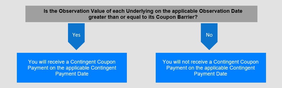 If, on any monthly Observation Date, the Observation Value of each Underlying is greater than or equal to its Coupon Barrier, we will pay a Contingent Coupon Payment of $9.417 per $1,000.00 in principal amount of Notes (equal to a rate of 0.9417% per month or 11.30% per annum) on the applicable Contingent Payment Date (including the Maturity Date). |