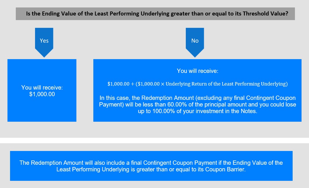 The Redemption Amount will also include a final Contingent Coupon Payment if the Ending Value of the Least Performing Underlying is greater than or equal to its Coupon Barrier. |