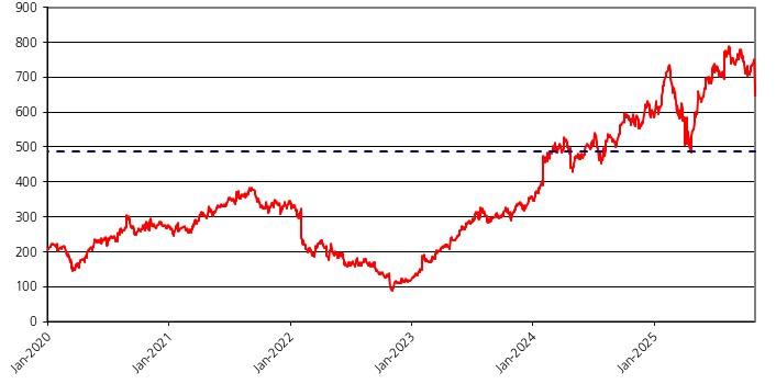 We obtained the information regarding the historical performance of the Reference Asset in the graph below from Bloomberg, without independent review or verification. The graph below illustrates the performance of the Reference Asset from January 1, 2020 through October 31, 2025. The dotted line represents the Contingent Coupon Barrier Value and Barrier Value of $486.26, which is equal to 75.00% of the Initial Value.