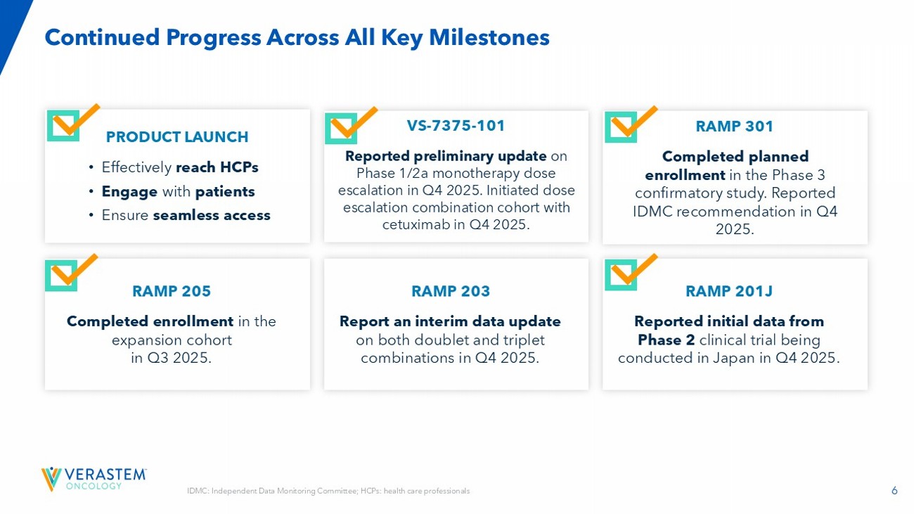 5 Anticipated Milestones FDA Approved Phase 3 Phase 2 Phase 1 Regimen Trial Name/ Therapeutic Area Asset RAF/MEK Clamp + FAKi RAMP 201, recurrent LGSOC Avutometinib + Defactinib Expect to complete enrollment of IDMC - recommended increase by Q1 2026 RAF/MEK Clamp + FAKi vs ICT RAMP 301, recurrent LGSOC Avutometinib + Defactinib Plan to report an interim safety and efficacy update in the 1H 2026 KRAS G12D (ON/OFF) inhibitor VS - 7375 - 101, Advanced solid tumors VS - 7375* Expect to report an update on the safety and efficacy of the expansion cohort in the 1H 2026 RAF/MEK Clamp + FAKi + gemcitabine, nab - paclitaxel PanCAN Collaboration RAMP 205, 1L mPDAC Avutometinib + Defactinib Report an interim safety and efficacy update in Q4 2025 RAF/MEK Clamp ± FAKi + KRAS G12Ci (sotorasib) Amgen Collaboration RAMP 203, advanced KRAS G12C NSCLC Avutometinib Defactinib RAF: Rapidly Accelerated Fibrosarcoma; MEK, Mitogen - Activated Extracellular Signal - regulated Kinase; RAS: Rat Sarcoma Virus; FAKi : focal adhesion kinase inhibitor; ICT: investigator choice of treatment; NSCLC: non - small cell lung cancer; mPDAC : metastatic Pancreatic Ductal Adenocarcinoma Our Pipeline: Addressing RAS/MAPK - Driven Cancers Not shown: *GenFleet Therapeutics has an ongoing Phase 1/2 clinical trial in China with VS - 7375, known as GFH375 in China. GenFleet retains greater China rights. Verastem has two undisclosed assets at discovery phase targeting the RAS/MAPK - pathway as part of the GenFleet collaboration.