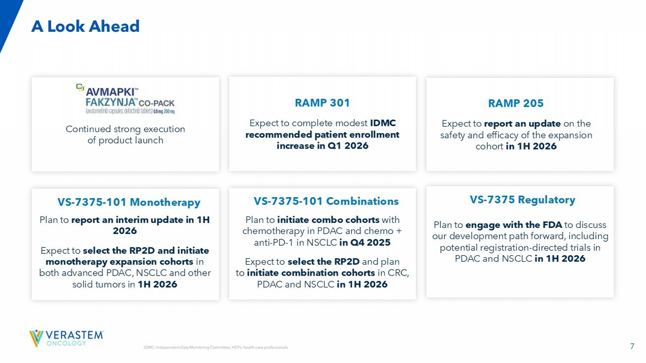 6 Continued Progress Across All Key Milestones RAMP 301 Completed planned enrollment in the Phase 3 confirmatory study. Reported IDMC recommendation in Q4 2025. RAMP 201J Reported initial data from Phase 2 clinical trial being conducted in Japan in Q4 2025. RAMP 203 Report an interim data update on both doublet and triplet combinations in Q4 2025. RAMP 205 Completed enrollment in the expansion cohort in Q3 2025. PRODUCT LAUNCH • Effectively reach HCPs • Engage with patients • Ensure seamless access VS - 7375 - 101 Reported preliminary update on Phase 1/2a monotherapy dose escalation in Q4 2025. Initiated dose escalation combination cohort with cetuximab in Q4 2025. IDMC: Independent Data Monitoring Committee; HCPs: health care professionals