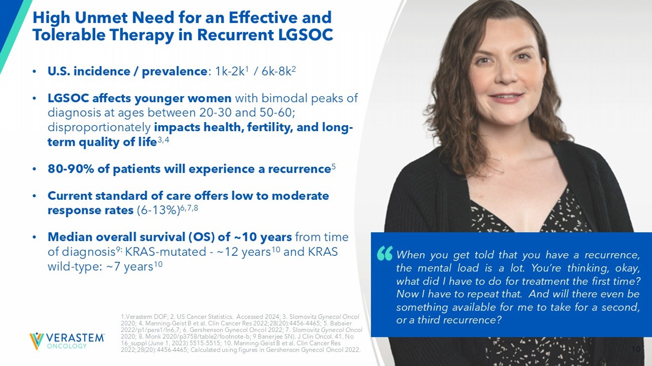 10 High Unmet Need for an Effective and Tolerable Therapy in Recurrent LGSOC • U.S. incidence / prevalence : 1k - 2k 1 / 6k - 8k 2 • LGSOC affects younger women with bimodal peaks of diagnosis at ages between 20 - 30 and 50 - 60; disproportionately impacts health, fertility, and long - term quality of life 3,4 • 80 - 90% of patients will experience a recurrence 5 • Current standard of care offers low to moderate response rates (6 - 13%) 6,7,8 • Median overall survival (OS) of ~10 years from time of diagnosis 9: KRAS - mutated - ~12 years 10 and KRAS wild - type: ~7 years 10 1. Verastem DOF; 2. US Cancer Statistics. Accessed 2024 ; 3 . Slomovitz Gynecol Oncol 2020; 4. Manning - Geist B et al. Clin Cancer Res 2022;28(20):4456 - 4465; 5. Babaier 2022/p1/para1/ln6,7; 6. Gershenson Gynecol Oncol 2022; 7. Slomovitz Gynecol Oncol 2020; 8. Monk 2020/p3758/table2/footnote - b; 9 Banerjee SN). J Clin Oncol. 41. No 16_suppl (June 1, 2023) 5515 - 5515; 10. Manning - Geist B et al. Clin Cancer Res 2022;28(20):4456 - 4465; Calculated using figures in Gershenson Gynecol Oncol 2022. When you get told that you have a recurrence, the mental load is a lot . You’re thinking, okay, what did I have to do for treatment the first time? Now I have to repeat that . And will there even be something available for me to take for a second, or a third recurrence?