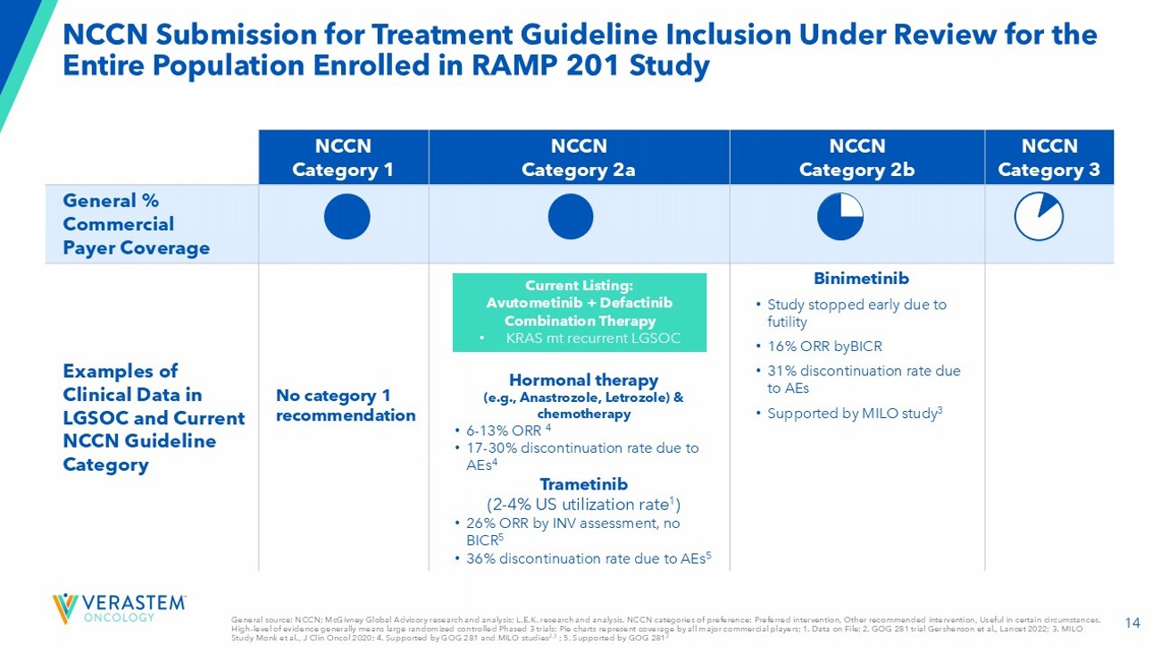 14 NCCN Submission for Treatment Guideline Inclusion Under Review for the Entire Population Enrolled in RAMP 201 Study NCCN Category 3 NCCN Category 2b NCCN Category 2a NCCN Category 1 General % Commercial Payer Coverage Binimetinib • Study stopped early due to futility • 16% ORR byBICR • 31% discontinuation rate due to AEs • Supported by MILO study 3 Hormonal therapy (e.g., Anastrozole, Letrozole) & chemotherapy • 6 - 13% ORR 4 • 17 - 30% discontinuation rate due to AEs 4 Trametinib (2 - 4% US utilization rate 1 ) • 26% ORR by INV assessment, no BICR 5 • 36% discontinuation rate due to AEs 5 No category 1 recommendation Examples of Clinical Data in LGSOC and Current NCCN Guideline Category General source: NCCN; McGivney Global Advisory research and analysis; L.E.K. research and analysis. NCCN categories of prefer enc e: Preferred intervention, Other recommended intervention, Useful in certain circumstances. High - level of evidence generally means large randomized controlled Phased 3 trials; Pie charts represent coverage by all major c ommercial players; 1. Data on File; 2. GOG 281 trial Gershenson et al., Lancet 2022; 3. MILO Study Monk et al., J Clin Oncol 2020; 4. Supported by GOG 281 and MILO studies 2,3 ; 5. Supported by GOG 281 2 Current Listing: Avutometinib + Defactinib Combination Therapy • KRAS mt recurrent LGSOC
